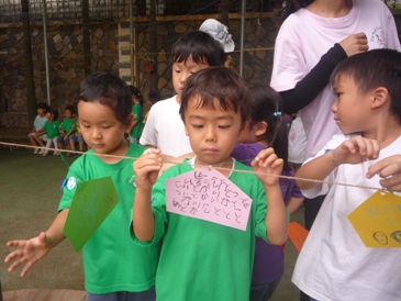 七五三は、日本の文化であり 小さな子どもたちにも、伝えていきたい行事でもあるので、 ここハノイでも、お楽しみ会を通して伝えていきました。 七五三の由来や、日本ではどのようなことをしているのかなど、 スライドで説明し、子どもたちもよくみていました。 異年齢グループに分かれて、各コーナーで楽しみました。 <けむりあび> 浅草寺の常香炉をイメージをして、 「香炉の煙を体の悪いところにかけると治りが良くなりますように」 と、言う意味で子どもたちと一緒にやりました。 『足が速くなりますように』 『頭がよくなりますように』 それぞれ、いろんな思いがありました。 <おみくじ> 大吉、中吉、小吉、吉 4つのくじが入っていました。 さぁー。。 どれがでてくるかな。。 じゃん!!でました!! 始めにおみくじの意味や内容を伝えていましたので、 「中吉、、2ばんだねー」といって、見せてくれました。 おみくじには、わかりやすいように、 イラストも載っていましたので、 「うさぎさんだー!」と、喜んでいました^^ 小さなお友達には、 ひらがなが読めるお姉ちゃん達が教えてあがる姿も見られていました。 みんなでにっこり、おみくじができました! <絵馬作り> 一人1枚、絵馬を作っていきました。 「字を書いてもいいし、絵で表現して描いてもいいねー」 と、子どもたちにお話していたので、 イメージが湧きやすく、しっかり描いていました。 「お友達と仲良くあそべますように」 「サッカーが上手になりますように」 1人ひとりの思いをしっかり絵に込めました。 さいごは、紐に括り付けて、 お母さん達にも降園時に見てもらいました。 子どもたちの世界が広がって、 天に届いているとおもいます^^ <お参り> 園庭には、1日限りのさくら神社が建てられて、 巫女さんも来てくれました!! 鈴を鳴らした後、『二礼二拍手一礼』も、子どもたちとても上手で、 さくら神社コインを持って、静かな気持ちで、参拝できました。 小さなお友達と一緒に、鈴を鳴らし、 気持ちを込めて、真剣にお願い事をしています。 可愛らしい姿を見て、 このまま大きくなってほしと 大人の願いも神様に届いてほしいです。 お楽しみ会の給食は、お楽しみランチ!! 全園児で集まって、たのしく食べることができました。 小さなお友達も一緒ですので、 お手伝いをしてもらって、もりもり食べていました。 これからも、 キラキラ笑顔輝き、のびのび育って、 大きくなってほしいと思います!! さぁー 12月はクリスマス会★ サンタさんが見てくれているかなー^^ (#082) ベトナム・ハノイの日系幼稚園 さくらHoaAnhDao幼稚園ホーページ |
