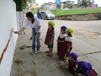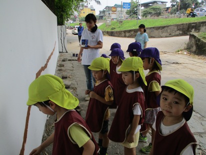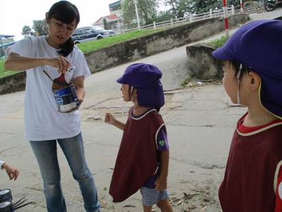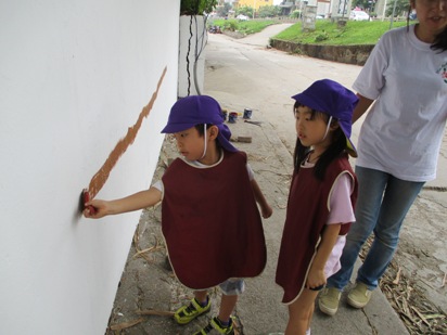 新しい壁面を描き始めました! まずは、一番最年長のさくら組(年長)のお友だちから、 ペンキで描いていきました。 おや? これは、何色でしょうか・・・・ この色でなにを描いていくのでしょうか? あれあれ? 茶色の線が描かれていきました。 子ども達の背の高さよりも、少し低いところに描かれていますね。。 わぁー!! こんなにも、長く伸びてきましたよ。 途中、坂道のようになったり、曲がったりする線になり、 端から端まで、この茶色の線が続いているようです。 お友達と順番に描いていき、「ここも塗ったほうがいいよ」 と、声をかけながら描いていきました。 最後まで描くと、次は、縦に線を入れていきます。 さぁー!! このあとどうなっていくのでしょうか^0^ 子ども達も、「次はなに描くのー?」「はやくまた描いてみたい!」 といって、楽しみにしています。 全園児で描いて、作っていく壁面☆ 新しい物語が、またスタートしました! どんな作品に仕上がっていくのか、たのしみですね。 また、少しずつ子ども達と作り上げていく様子をお知らせしていきます◎ (#082) ベトナム・ハノイの日系幼稚園 さくらHoaAnhDao幼稚園ホームページ |
