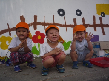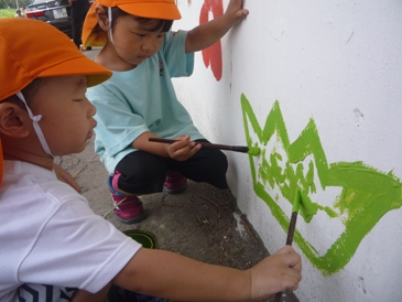 少しずつ、外の壁面が出来上がってきて、 とても、たのしい様子が伝わってきています!! 職員が下書きしたところを、子ども達がなぞって、塗っていきました。 細かいところなどは、さくら組さん(年長)が丁寧にやってくれました! はみ出さないように、ゆっくり慎重にしているのが分かりますね! お花や草は、さくら組さんが鉛筆で下書きをしてくれて、 ペンキで色をつけていきました。 色の組あわせもかわいいですね◎