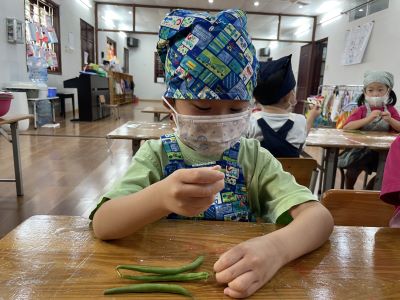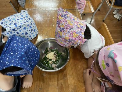 7月のクッキングは、インゲンとツナのマヨネーズ和えを作りました。