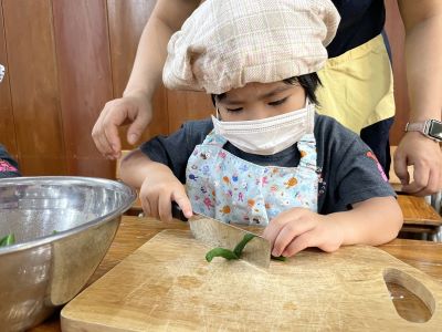 ①包丁使ったことある人〜? たくさん手があがりました♪ ②まずはじめにいんげんのすじを取りました。 ②集中してすじを取っています! ④興味津々にいんげんをゆでる様子を見ています。「おいしくな〜れ!」とおまじないをかけました! ⑤待ちに待った包丁切りです。 ⑥猫の手でいんげんを押さえて、切っています! ⑦ゆでたいんげんの味見をしました。 先生「いんげんのお味は•••?」 子「•••」(笑) ⑧いんげんボウルにツナとマヨネーズ、しょうゆが入りました♪ ⑨まぜまぜ!まぜまぜ! 混ぜ終わった後、味見をすると•••「おいしい〜!」「もっと食べたい〜!」との声があがりました♪ ⑩「おいしい〜!」と言って、おかわりして食べている姿もたくさん見られました!自分たちで作ると格別の味ですね♪ 次のクッキングは、9月の夏休み明けです☺ 次はなにをつくろうかなぁ~!! ※インスタグラムでも、日々の様子が見られますので、そちらもご覧下さい!!(1863)