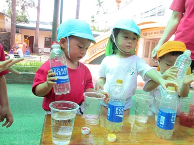朝はお母さん達に「いってきます!!」とした後は、 お支度を毎日自分でやっています^^ 一生懸命に、自分達の身の回りのことをやり、 「せんせいー!!できたよ」と、笑顔で教えてくれます。 こうやって、自分でやってできた!!自信と達成感を、大切にしていきたいと思います。 暑いハノイですが、『色水遊び』をしたりして、 外で楽しく活動をしています。 水も、子ども達がよいしょ!よいしょと、カップに入れてきて、 色を混ぜて、「オレンジー!」と言って、たのしんでいました。 野菜スタンプで魚を作りました。 クレヨンで目を描き、それを糊でつけていきます。 おっとー!!のりをつけすぎてないなかなー^^; 隣のお友達も見ていますね! さぁー お魚の模様は、『野菜スタンプ』 今回は、オクラ、玉ねぎ、パプリカを使用して、ポンポンスタンプをしていきます。 「わぁー!!ついた!」と言って、みているお友だちの表情。 色んな経験が、一人ひとりの大発見になっていますね◎ かわいい連発!!!! オクラは、お星様みたいだね!と伝えると、 自然と「キラキラ星」を歌いだす姿も見られて、日々の成長に感動しますね★ この魚たちがどうやって作品になっていくのか楽しみですね◎ いちばん小さなお友だちも、さくらっこらしく、 毎日キラキラと輝き、たくましく、大きくなっていっています。 そして、日々、、「かわいいー!!」「かわいいねー!!」を、 連発しながら、子ども達を見守っています^^ ※インスタグラムからでも、幼稚園の様子が見られます。是非、みてみてください。 (#082) ベトナム・ハノイの日系幼稚園 さくらHoaAnhDao幼稚園ホームページ |