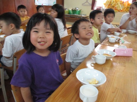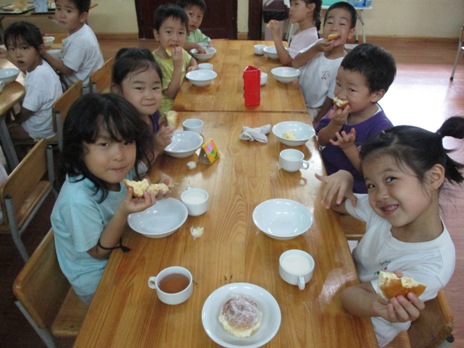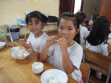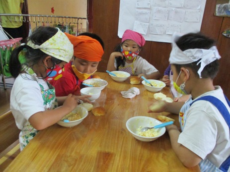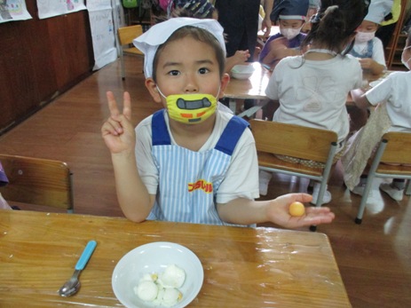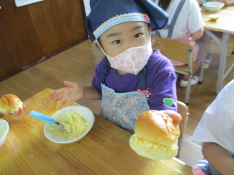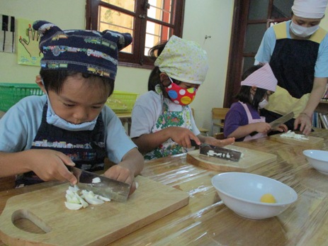 さくらぐみのクッキング 今回は ”ふわふわたまごサンド” さあ、クッキングスタート! 朝一番に、あらかじめ卵を子供と一緒に茹でておきました。 水の入ったお鍋に卵を入れるのも、そーっとね。 火にかけて13分。固ゆで卵が茹で上がりました。 エプロンと三角巾をつけてと。 卵の殻を剥いていきましょう! スプーンで殻に割れ目をつけてから 慎重に剥いていきます。 白身はとてもやわらかいので、すぐにほろっと崩れそうになります。 あわてず、あせらず、ゆっくりゆっくり… 細かい指使いや、集中力、注意力を育ててくれるクッキング。 楽しみながら学べる、卵はすてきな先生ですね。 殻をむいた卵を、白身と黄身に分けましょう。 かわいいお月様が出てきましたよ! 大成功 今回のふわふわ卵の秘密は、白身を細かくきざむこと。 みじん切りも上手になってきました。 子供たちの、この表情。 がんばっていますね! 包丁の先を片手で押さえて、取っ手を動かして刻んでいく 刻み技にも、挑戦しました。 白身を刻むのは、なかなか大変ですよ。 美味しいサンドイッチを食べるまでの道のりは もう少しです!がんばれー 刻んだ白身と黄身に、マヨネーズ・塩・砂糖を少々。 しっかり混ぜていきます。 「これくらいかなー? オッケー! バターをぬったパンに卵をはさんで できあがり! ふわふわサンド!はやく食べたいよー!! おやつまで待てないよーーー サイコー!! 大満足のこの笑顔 すずらんぐみさんからも、大好評の「おいしー!」いただきました あっという間にたべちゃった。 「もっとたべたかったなー」 お家でまた作りたいという声もたくさんありましたよ。 さて、次のクッキングもお楽しみに。 (まんごーさん) ベトナム・ハノイの日系幼稚園 さくらHoaAnhDao幼稚園ホームページ |