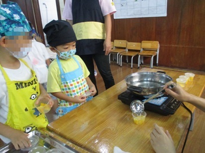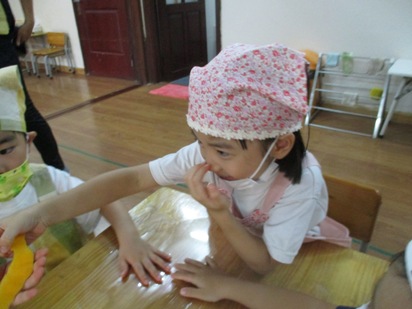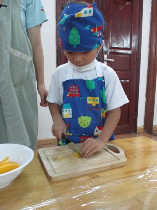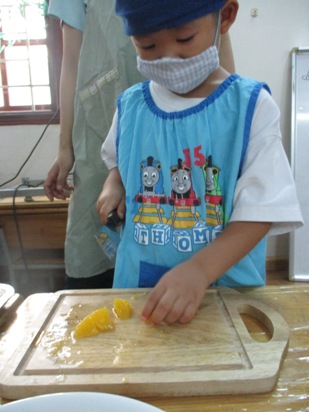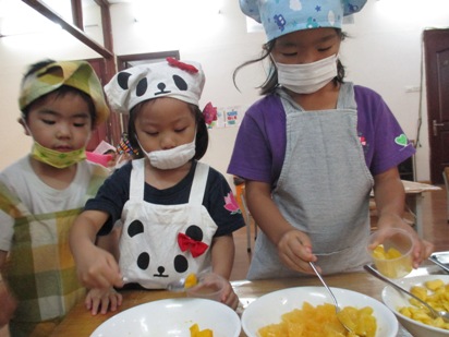 少し前から、子供たちと話をすすめていました。 「何のフルーツが入れたい?」いろいろなフルーツが登場しましたが、季節や今の時期でもハノイで食べられる物、 マンゴー・オレンジ・パイナップル!!さあ、みんなで楽しくクッキングスタートです! さて、マンゴーの皮をむいて、果肉を取っていきますよ。 ちょっと、皮のにおいを くんくんくん。 「いいにおいーーー!はやくたべいよーーー。」 フルーツの下ごしらえが、終わったのでさっそく切っていきますよ。 包丁を使う時のおやくそくは… ①まな板と自分のおへそはぺったんこ。しっかり、正面に立ちましょう。 ②包丁を持ったら、反対の手は"猫の手”でささえましょう。 ③包丁に果物がくっついてしまったら、上から下へ滑り台のように しゅーっと落としてあげましょう。 ④包丁を使い終わったら、まな板の向こう側に刃を むこうに向けて置きましょう。 みんな、包丁を使うのがとても嬉しいんです。 真剣にな表情で切っていますね。 さあ、フルーツがすべて切れました! カップに自分の好きなフルーツを入れていきますよ。 ![]() 砂糖とゼリーの素を入れた、ゼリー液をいれて、 冷蔵庫で冷やせば… 完成でーーーす!