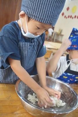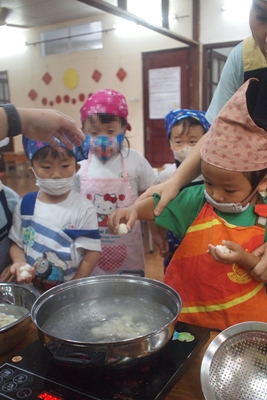 ![]() 十五夜ということで今回はお月見団子を作りました♪ 前からお月見団子を作ると伝えていたので、 粘土をした時にはみんながお団子を作って練習していた研究熱心なすずらんぐみさん(^^) この日は本当に食べられるお団子作りということで 朝からそのことで頭がいっぱいの子ども達。。 「先生、お団子いつつくるの?」と朝から質問攻めです ![]() お昼寝が終わってから作る予定だったので、お昼寝の前に 「作ること忘れてないよね?」と何度も確認、、 お昼寝明けは「クッキングだよ!」というと、 いつも以上にテキパキとお布団を片付けて あっという間にエプロンを着ている子ども達!相当楽しみにしていたようです♪ 始めに豆腐と白玉粉と砂糖を手でコネコネ。。 耳たぶくらいのやわらかさになるまでひたすら真剣な表情でコネコネ。。 「いいんじゃない?」「いい感じ!!」 などと声を掛け合っています♪ 次はお得意のまるめる作業! もう手馴れたものです。 大人顔負けの綺麗なまんまるお団子をたくさん作ってくれました! それではお湯に団子を投入~! 熱いからお湯がはねないようにそ~っと。。 「おいしくなーれ、おいしくなーれ」のおまじないをかけて お団子が浮いてくるのを待ちます。 「お団子ちゃんがんばれー!」 「あともうちょっとで全員浮いてくる!がんばれ!」 と応援していました(笑) 茹で上がったお団子にきなこをつけて完成! 出来立てのお餅を食べて「おいしい!おいしすぎるね!」 と目をまんまるにして喜んでいました♪ 全員おかわりをして大満足なクッキングでした! とても簡単にできるし楽しいので是非おうちでもしてみてください! レシピ↓ さくらHoaAnhDao幼稚園(potato) ベトナム・ハノイの日系幼稚園 さくらHoaAnhDao幼稚園ホームページ |