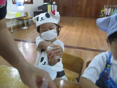 エプロン、三角巾、マスクの3点セットをそれぞれが準備して 持ってきてくれました。ありがとうございます。 いよいよ、お楽しみのクッキングが始まりです。 クッキングの支度はほとんどの子が自分で着用し、 三角巾もつけやすいもの準備してくださったので、 子ども達は自分でつけることができました。 あっという間に支度が整い、手洗い、消毒をして 給食の色グループごとに座りました。 今日は『白米くん』ではなく、ふりかけおにぎり『おにぎりくん』を 作るよと話をしました。そこで… 『ふりかけくん』と『しゃもじくん』が登場。 2人に助けてもらっておいしいおにぎりを作り始めました。 どんな匂いがするかな~。「いいにおいがするー」と笑顔がこぼれます。 白米とふりかけを混ぜます。 しゃもじくんと一緒においしくなあ~れと混ぜていきました。 まぜまぜ…たのしいね。 よく混ざったかな! 「次は〇〇ちゃんね!」と順番に混ぜました。 次のお友達にもご飯が入ったボウルを「はい!」と優しく手渡してあげる姿も 見られました。 次は、お皿のラップに一人分のご飯を乗せていきます。 しゃもじも上手に使いこなしています。 ゛おっと、おもたい゛と言いながら慎重に乗せていた子ども達です。 そして最後にラップにくるんで「ぎゅっぎゅっ」 力の加減がまだ難しいですが、おいしいおにぎりになるよう、 気持ちを込めて作りました。 みんなとってもいいおかお おやつの時間。今度は、のりくんが登場。 ふりかけおにぎりのところに遊びにきたとのことで… 少し前にホールに集まって、自分達でのりをつけました。 おにぎりくんとのりくんは仲良くなりましたとさ。 じゃじゃ~ん。「できたよ~」と嬉しそうに見せてくれました。 自分の手より大きなおにぎり!!お口に入るかな。 「あ~ん」 こんなに大きなおにぎりは初めてだよ。とばかりに笑顔もこぼれます。 初めてのお友達とのクッキング、初めて自分で作ったおにぎり。 エプロン、三角巾、マスクを見につけてのクッキング。 どれも子ども達にとって楽しい経験になりました。 次回のクッキングも楽しみにしています。 (おはな) ベトナム・ハノイの日系幼稚園 さくらHoaAnhDao幼稚園ホームページ |