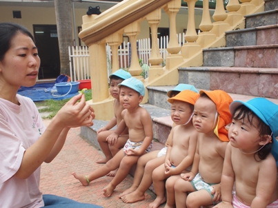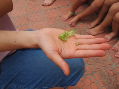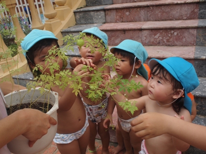 夏休み前、白くて可愛らしいお花は咲いたけど 楽しみにしていた実はならず・・・。 夏休み中に実がなってくれることを祈りつつ お休み中も、警備員さんがせっせと水をやってくれていました。 そのお陰で?夏休み明け元気なさくらっこ達の声を聴いたから? なんと、ついに実がなりました☆ 登園後に、すぐに気が付いたお友達もいました。 「ふうせんができてるよー!!」数名で大盛り上がりです。 中には、日本でフウセンカズラを見てきたお友達もいて 「これね、中に種が入っているんだよ」 と、教えてくれました。 今日は、いちご&もも組さんのお友達が 水遊び前に観察していました。 「優しくさわってみてね」の声掛けにみんなそっとさわります。 でも、やっぱり風船も割ってみたい!! と、職員の目を盗んで割ってしまったお友達。 「あー、割れちゃった。。。」 と、寂しげに。 でも、せっかくだから中も見てみよう。 中には、こんなかわいい種があるんだよ。 「風船が、茶色くなるまで待って中を開けると 黒と白の種に変わるんだよ」 と、先生が話すと、言葉を覚えたてのいちご組のお友達が 「たね?」とつぶやきます。 実物の種を見て、初めて言葉の「たね」と種が結びつきます。 こんな小さなことも、素敵な瞬間。 ほら、こんなに真剣に見ています。 風船、たくさんとりたいけどもう少し黒い種になるまで待って 来年もまた植えましょうね。 (たこ) ベトナム・ハノイの日系幼稚園 さくらHoaAnhDao幼稚園ホーページ |