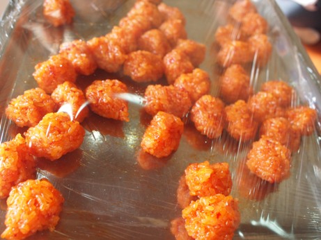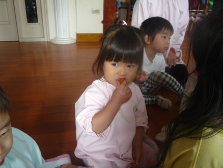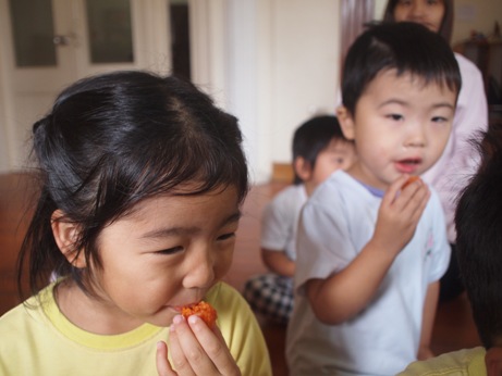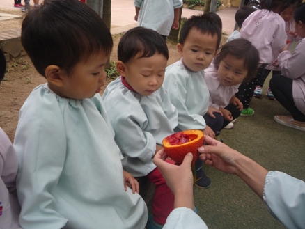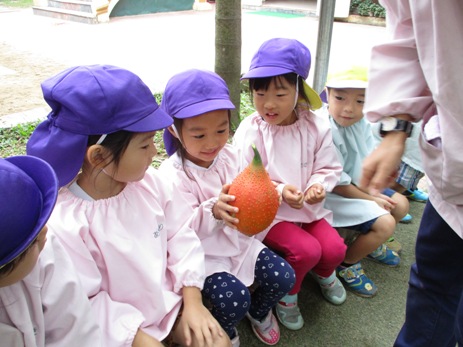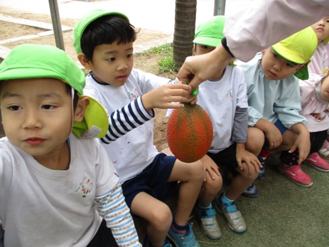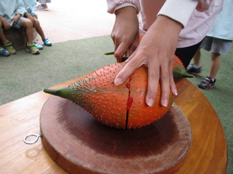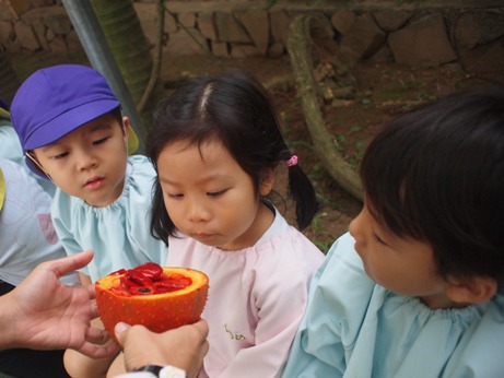 みなさん、このフルーツ 何かご存知ですか? 私も、ベトナムに来て初めて出会いました。 ガック変わった名前ですよね。実はこのフルーツは、スーパーフルーツと言われている すごいフルーツなんです! ![]() ★トマトの70倍のリコピン ★人参の10倍のベータカロチン その他にも、ビタミンA ビタミンE 亜鉛などの栄養価が高く かつてベトナムで、ビタミンA欠乏症に悩む子ども達への ガックの摂取が国家プロジェクトとして促進され、 多くの命が救われたこともあるそうです。 ![]() さて… 最初は緑色だった実が、だんだん赤く色づき 収穫の季節がやってきました。 今年もガックを、子ども達と収穫してみんなで盛り上がりたいと思います。 ![]() さあ、このオレンジ色の実…中身は? ザクリ!こんな感じなんですね。 ![]() 真っ赤な果肉に包まれた大きな種がごろごろ。 匂いは、不思議なくらいに無臭です。 真っ赤な果肉を外してみると、 黒い種が飛び出してきました! ![]() 実は、この種もベトナムでは薬として使われています。 種をお酒につけた液を、関節痛や傷口にぬったりして 昔から使われているそうです。 それでは、収穫祭の様子をご紹介します。 ![]() 警備のクアンさんが、はしごに登って採ってくれました。 子ども達の視線を一度に受けて、クアンさんも気合が入ります。 すごーい!! 大きいねーー。 ![]() ちくちくするから、優しくさわってね。 ![]() ずっしり 重たいねーー! 優しく持てば痛くないよ!だいじょうぶ ![]() みんな興味津々。 ![]() 順番を待つ子ども達の目も、ガックにくぎ付けです。 いままで玄関にぶら下がっていたガックが今は目の前に。 子ども達、いい顔してますねーーー! 中身を見ると、まかっかーー! おそるおそるのぞきこむ、ももぐみさん。 くんくん あんまり匂いはしないよーー。 くろい種も不思議だな。 鉄の塊のようにも見えるし・・・ さて、このガックの一番一般的な食べ方は ガックのおこわ(ソイ ガック) です。 すこーし砂糖を入れた甘めのおこわです。 ![]() 子ども達にも、一口づつガックの味見。 給食先生が、作ってくれました。 人生初のソイガックを、ぱくり。 『ん~~~、なるほどーーーーもぐもぐ。』 色は、鮮やかなオレンジ色。 ガック自体に、味や匂いがないので もっちり甘いさくらもち?のような感じが近いかもしれません。 『うん!おいしい ![]() 子ども達は、気に入った様子。 ![]() こうして、ガック収穫祭は終わりました。 収穫してから、実際に見て触って匂って、 子ども達の好奇心を大いにくすぐってくれたガックの実たち。 自然の恵みに感謝です。 玄関になっているガックは、まだまだたくさんあるので ほしいご家庭には、おすそわけ。 ガックフィーバーが過ぎた後も、 ガックたちは静かに子ども達を見守っているのです。 (まんごーさん) ベトナム・ハノイの日系幼稚園 さくらHoaAnhDao幼稚園ホーページ |