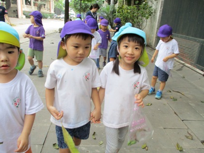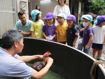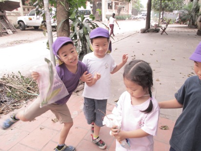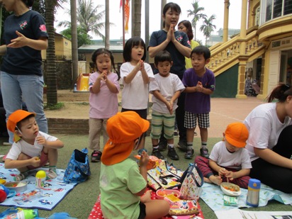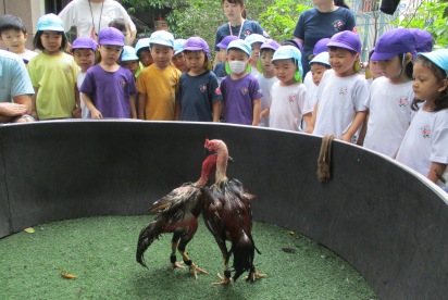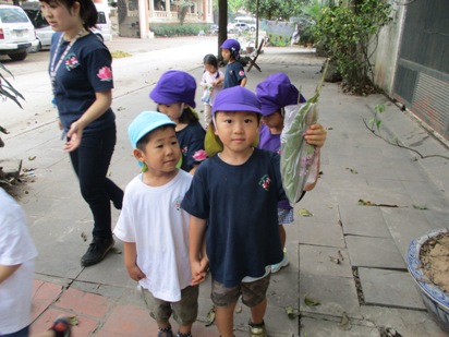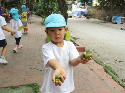 これから、暑くなっていく…ハノイ◎ 涼しく、散歩日和な時期は今しかない!! ということで、さくら組(年長)すずらん組(年中)で 近くに散歩へ出かけました。 進級して初めての散歩で、 今まではさくら組のお友達が、お兄ちゃんお姉ちゃんに守られていたのですが、 次は!!自分達がすずらん組を守る側になり、 「ほら~さくら組が守るんだよー」っと、友達同士で声をかけていました。 いつものコースでも、 この時期ならではの発見がたくさんあり、小さなお花を見つけたり、 バラがもう少しで咲きそうだったり、湖ではアヒルの親子が泳いでいたり、 子どもたちの目線と大人の目線では、発見が違い、 「みてみてー!!!!!」の、連発でした。 そして、葉っぱやマンゴーの赤ちゃんがたくさん落ちていました。 「みてみて!もう持てないよー」 と言って、見せてくれました^^ほんとに、両手にいっぱいのマンゴーの赤ちゃんですね! 一生懸命に拾う姿も、なんともかわいらしい姿ですよね◎ 袋いっぱいに拾う事ができました。 隣のすずらん組さんが、「さすがお兄ちゃん!!」と言う様子で見ていますね^^ 「やったー!いっしょにこんなに拾えたよー」 と言って、嬉しそうに踊って!見せてくれました。 嬉しさが、すごく伝わりますね。 少し歩いていくと、なにか発見しました。 『闘鶏』を間近で見ることができました。 興味津々で、「これからどうするのー?」「どっちが強いのかな?」 と言って、覗き込んでみんなで応援です! 職員も、はじめて見たので子ども達と大興奮でした。 いろんな発見と、うれしいお土産を持って幼稚園に帰りました。 そして、この日は今年度初めてのお弁当の日!! 朝から「お弁当まだ?」「はやく食べたい!!」と、言っていました。 全園児がそろって、外でお弁当を広げます。 お当番さんが、前に出てご挨拶をしてくれます。 「おべんとういただきます!」 「どうぞ!めしあがれ」 お友だちと一緒に外で食べるお弁当! 愛情たっぷりのお弁当は、特別おいしくて、ウキウキな気持ちが伝わってきました^^ 初めてのお弁当の時間も、 お友だちと一緒でたのしく食べる事ができました。 すでに、「次のお弁当は何にしょうかなー」 と、考えているお友達もいましたよ。 しっかり遊んで、しっかり食べて、 さくらっこ達は、毎日元気に過ごしています。 暑いハノイになったら、どんなことしてあそぼうかなー (#082)ベトナム・ハノイの日系幼稚園 さくらHoaAnhDao幼稚園ホームページ