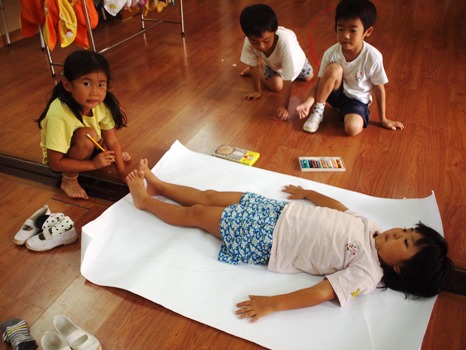 さくら組(年長)は、 4つのグループを子どもたちで作り、等身大のハロウィン衣装を作りました。 まずは、どんなものを作りたいか話し合い、下描きをすることからはじめました。 男の子達の方が早く決まり、 女の子達は、こだわりと、憧れが作品表れていて、下書きのところから、 ここは、ピンク!ここにキラキラをつけたい!という想いが表れていました。 そのあと、 模造紙の上に寝転び、なぞって土台作りです。 指の間もなぞって、「こんなに大きいんだねー」と言って、 自分の形をみていました^0^ グループの中では、 頭は、○○ちゃん!足は、○○君!と言って、 分かれて描いているグループもいて、みていて思い白かったです。 形が出来たら、 クレヨンや絵の具で塗ったり、紙をちぎったり、シールを貼ったりして、 それぞれの素敵な衣装を作っていきました。 各グループが、下書きの時よりも、想像力を膨らまして、 「やっぱり、ここは違う方がかわいいよー」 「もっと、キラキラつけよう」と言って、 思い思いに作り出し、個性が溢れていました!! 一体これをどうするんだろう・・?と、何度も思うほど、 大人では考え付かない発想や、工夫の連続でした。 そして、4日かかって… やっと完成しました!! 自分達のグループだけでなく、お友達のグループの作品を見て、 「ここのキラキラすてきだね!」 「いっぱい貼ってすごいねー!どうやってつくったの?」 「目もかわいいし、全部かわいい!!」 と言って、友達のことも認め合ったりする姿が見られました。 1人ではなかなか作り上げることが出来ないことも、 みんなで、アイデアを出したり、時には、意見がぶつかることもありながらも、 一つの作品が出来上がった時の、喜びは大きなものだと思います。 こういう経験を大事にしながら、 これからも様々な活動に取り組んでいきたいと思います。 (#082) ベトナム・ハノイの日系幼稚園 さくらHoaAnhDao幼稚園ホームページ |