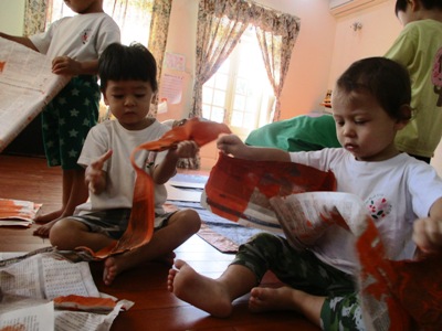 開館します!! 毎年この作品展では、異年齢で作り上げていく大型作品がありますが そのグループ活動が始まっています。 今年のテーマは、 『遊園地』です!! 聞いただけで、、、わくわくが止まらない子ども達の表情が目に浮かびますね◎ その日その日の活動は、子ども達一人ひとりに聞き、 子ども達自身がやりたいことを選んで、活動に参加します。 小さなお友達も、イメージがわきやすいようで、 「今日はバス作るのー!!」「一緒に、観覧車つくろうねー」と、 話をする姿が見られています。 この、大きなダンボールは何を使うのでしょうか。。 子ども達からの発想は無限で、「こんなのがいい」「こうしたい!」と、 みんなで話し合って作っていきます。 小さなお友達も、ビリビリ上手に新聞をちぎっています。 「こくらい?」と、お兄ちゃんたちに聞いてちぎる姿や、 「じょうずにできてるー」と、言ってくれるお姉ちゃんたちの姿もあります! 絵の具活動もダイナミックに取り組んでいます。 この色で作られたものは、何になるんでしょうか。。 たのしみいっぱいですね! 筆で、色を塗るのも上手になってきました! こんなに楽しみながら、いい表情で活動しています。 大人も、子ども達の表情をみると楽しみになってきませんか?! 色んな活動を通して、子ども達は大きくなっています。 完成を楽しみにしていてください! 毎回のお洗濯、準備、廃材のご協力、本当にありがとうございます。 #082 ベトナム・ハノイの日系幼稚園 さくらHoaAnhDao幼稚園ホームページ |