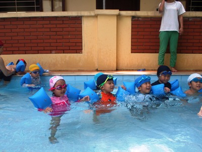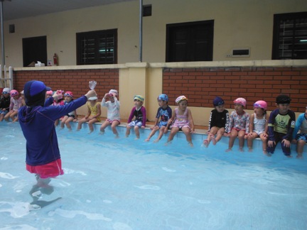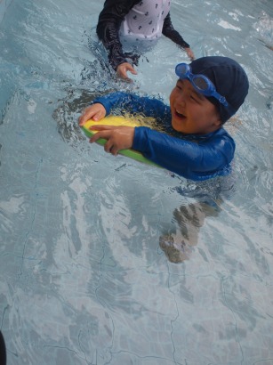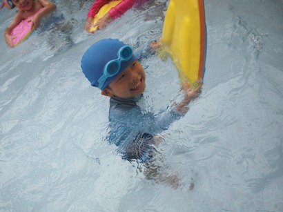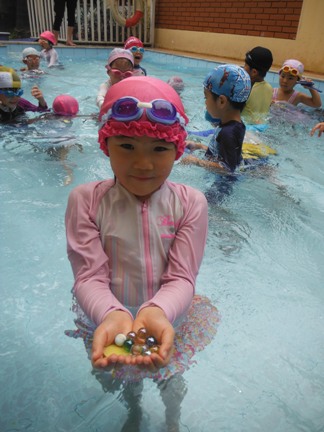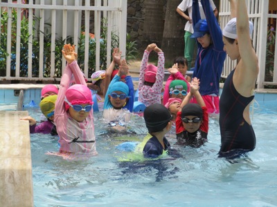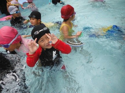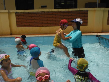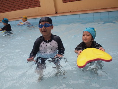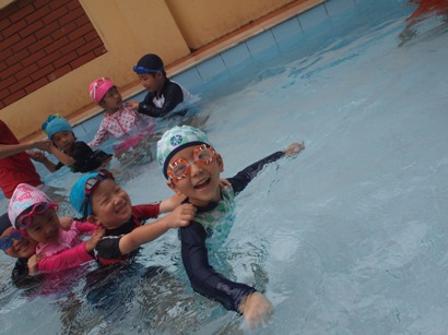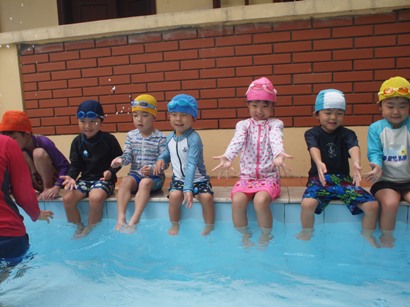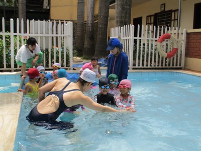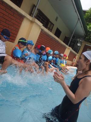 第1回目の年中長組さんのプールがありました ホールで元気いっぱい体操をしてから、、、 年中長合同クラスの『らっこ』グループ、『ぺんぎん』グループに分かれゆったりと楽しみました。 プール開きでさくら先生にもらった『お塩』と『お酒』に『怪我なく楽しめますように』と願いを込めて撒きました 足をジャブジャブ、お水をかけて、ゆっくりプールの中へ 気持ちいいねー!と全身で楽しむ子どもたち みんなで列車に変身したり、 だるまさんが転んだ、や宝探しを楽しみました☆ はじめは大きなプールにちょっぴりドキドキした子も、壁を支えに歩き、 先生を支えに歩き、最後はビート板を手に、 ゆっくりみんなと一緒に楽しむことができたようです 先生に『ジャポーン』と投げてもらい、ダイナミックに楽しむ子も♪ 今年は、毎週木曜日に年中年長の子どもたちを対象に、 ルネサンスのスイミングのコーチに来てもらい水泳指導をしてもらっています。 そちらの様子もご紹介したいと思います☆ まずは水をかけて、体をならしていきます。 バシャバシャバシャーっ!! お水が顔にかかっても大丈夫☆ おそるおそる、お水の中に入っていましたが… 手を離して一人で歩けるよ! ジャンプ!ジャンプ!で端っこから端っこまで。 お顔を水につけてみたり、潜ってみたり… こちらでは、バタ足に取り組み中。 手はどんなかたちになるかな? 三人ずつ、行きますよー。並んでくださーい! ピッ! 笛の音でスタート。 おっ!しっかりお顔を水に付けて上手ですね。ガンバレ~!! あっという間に30分たってしまうプールの時間です。 (レゴ・ぁゅみ) ベトナム・ハノイの日系幼稚園 さくらHoaAnhDao幼稚園ホーページ |