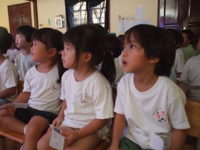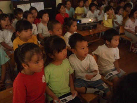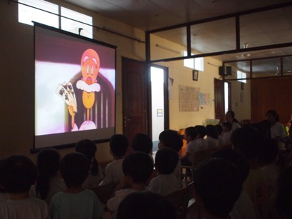 幼稚園ホールに大きなスクリーンとたくさんの座席が用意され、映画館に大変身! 今回のお話は日本昔話より『三枚のお札』と『そこつそうべえ』の二本立て 前々日に『館長』のさくら先生からチケットをもらい、とっても楽しみにしていた子ども達 今回はなのはな組、すずらん組、さくら組での鑑賞となりました チケットに書いてある番号と同じ座席に座り映画の始まり♪ はじめて参加する新入園児のお友達もお約束をしっかり守り楽しく鑑賞 『三枚のお札』では大迫力の『やまんば』に思わず目を瞑る子も。。。 『こわいよ~』と声が聞こえれば、さすが年長児のさくら組さん。。。やさしく手をつないでくれました。 これには保育者の出番もなし!怖がっていた子も、最後まで鑑賞することができました ありがとう 打って変わって『そこつそうべえ』ではおっちょこっちょいのそうべえさんに子ども達も大笑い 『次は10月、早くみたいな』という声が早速聞こえてきましたよ エンディングの『にんげんっていいな』をみんなで歌い終了しました♪ (ぁゅみ) ベトナム・ハノイの日系幼稚園 さくらHoaAnhDao幼稚園ホーページ  |