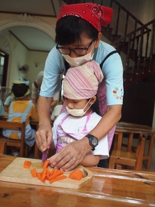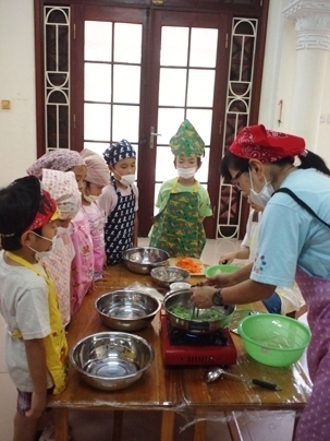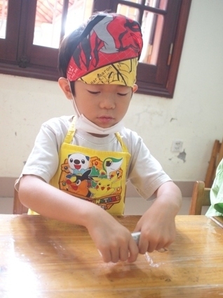 包丁を持ち*猫の手*でにんじんをおさえてコトンコトン・・・・保育者と丁寧に切りました。 さやいんげんは、指先でつまんで糸を引いた後は、お湯にひとつまみお塩を入れて鮮やかな緑に茹でます。 (1.2分程度)さやいんげんも半分にカット♪♪ *さあ!!下準備は、OK!! ライスペーパーに、人参、さやいんげん、茹で豚、ブンをのせてくるくる~ 完成!! *お皿に1本、2本、と手つきも良く出来上がってくると・・・チョッとお味見♪♪ *ムクマムのたれにそっとつけて* いただきまーす!!*** *子ども達の笑顔がほころびました♪♪ ベトナム・ハノイの日系幼稚園 さくらHoaAnhDao幼稚園ホームページ |