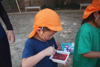 色水遊びや氷遊びが大好きなさくらぐみの子どもたち。 最近、色同士を混ぜると何色ができるかっということがわかり、 今回は子どもたちが実際に色水遊びの時に作った色や、新しく作った色を卵パックやヨーグルトの容器に入れて凍らせて、氷絵具を作りました。 氷なのですぐに溶けてきて時間との戦いでしたが、自分が作った色やお友だちが作った色を貸し借りしながら絵を描いていきました。 描きかたも工夫してみたり、色使いも考えて描く姿も見られました。 楽しすぎて、あっという間にすぎていったお絵かきの時間でした。 |