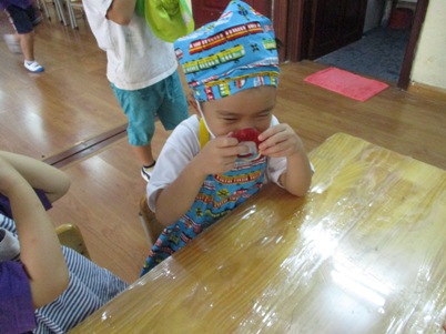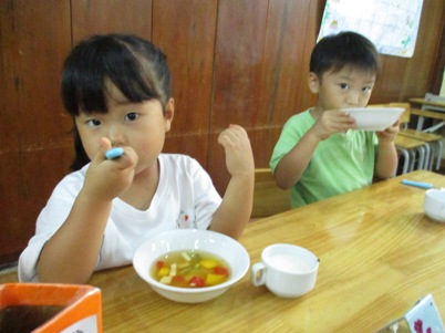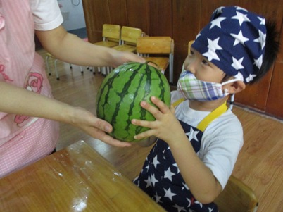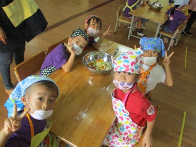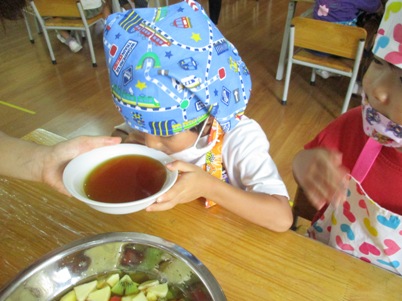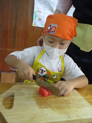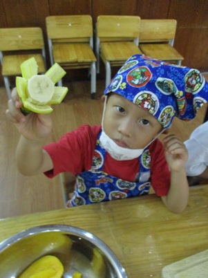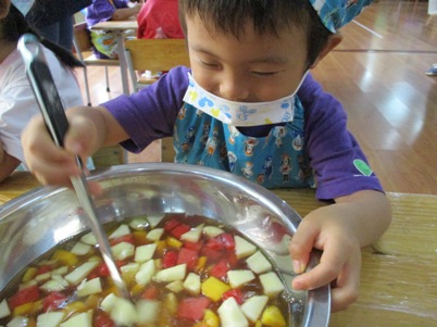 今日は何を作るの?と聞くと、「爽やかフルーツポンチ☆」と 元気に答えてくれました~^‐^ ☆はじめに包丁の使い方☆ すずらんぐみでは2回目の包丁ですね。 果物を持つ手はねこのて。 包丁に果物がくっついたら、すべりだいで しゅっ~。など しっかり耳を傾けて聞いていた子どもたちです。 さあ~今日は5種類の果物を用意しました 果物を見て、触って、匂いをかいで…五感を使って楽しんでこそクッキング 「えっ!かるいよー」と余裕な表情 クンクンクン……どんな匂いがするかな。 バナナの皮も自分で!!! 包丁を使って切ってみよう 実際に切るのはマンゴー、りんご、スイカ、バナナの4種類。 はじめは先生に手を添えてもらいながら一緒に切りました。 「トントントン」と良い音が聴こえてきましたよ~~~ リズムにのってゆっくりと。 一人で切ることにも挑戦です。じょうずだね。 ゛イエ~ィ☆みんなで力を合わせて切ることができたね。 次に… これはなあに? 匂いをかいでみたところ、 「キャラメル」「しょうゆ」「なんか甘い匂いがする」と色々な意見が。 ヒント!!先「蜂…」子「はちみつ」 何に使うかわかるかな。 最後はジュース作り 水、りんごジュース、はちみつをボウルに入れていきます。 美味しくなあ~れ!と気持ちを込めて、おたまで混ぜました。 さて、おいしいジュースできたかな~ 「先生、味見していいかな。」 「ちょっとだけだよ」とオッケー 「おいし~い」 合格サインで「やった~」と大喜びでした。 おやつの時には白玉も仲間入り。楽しみだね! 「これ、ボク、ワタシが切ったやつだ。」と喜びを噛みしめながら食べていた 子供たちです 自分でつくったものは特別だよね^〇^おいしかったね♪♪ またクッキングしようね (おはな) ベトナム・ハノイの日系幼稚園 さくらHoaAnhDao幼稚園ホームページ |