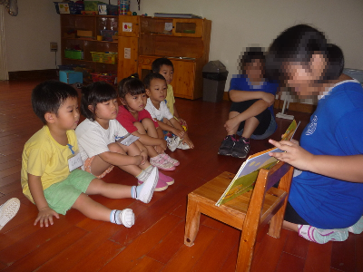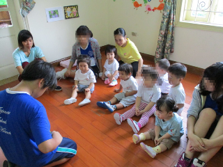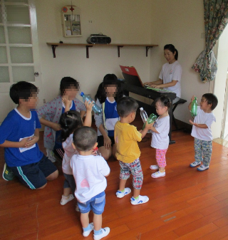 子ども達も、前日からすごく楽しみにしていて、 お兄ちゃん、お姉ちゃんたちの姿を見ると、 「はやくあそびたーい!」と、言っていました。 早速、子ども達に、劇『ドラたろう』という、オリジナルの劇を見せてくれました。 子ども達も知っている、キャラクターが出てきたこともあり、 すごく喜んでみていました。 その後、 各クラスに分かれて活動を始めました。 もも・いちご組 (年々少・1歳児クラス) もも・いちご組には、3人のお兄さんお姉さんが来てくれました。 最初はちょっと緊張気味だった中学生や子供たちでしたが、 お兄さんお姉さんが、まず袋から取り出したのは、 鈴のはいった手作りのマラカスでした! さっそく手にとってシャカシャカと 楽しそうに振りはじめました。 子供たちは音の出るものが大好き! うさぎの音楽に合わせて、飛び跳ねながらマラカスを鳴らし 教室の中に和やかな笑顔が溢れました。 中学校のお兄さんお姉さんは、今日の日のために たくさんの遊びを準備してきてくれました。 次は、子供たちが大好きなダンボールのトンネル! 吸い込まれるように、どんどんトンネルを抜けて行く子供たち。 トンネルを出たときに、お兄さんやお姉さんとにっこり顔を合わせる表情は とても生き生きとしていて、微笑ましい光景でした。 子供たちに絵本を読んでくれているところです。 お兄さんの語り掛けに、じっと耳を傾ける子供たちです。 その他にも、お着替えを手伝ってもらったり お給食の時間を一緒に過ごしたり、お兄さんお姉さんに 存分に甘えて楽しい時間を過ごすことができました。 (まんごーさん) なのはな組(年少組クラス) なのはな組の子ども達。。。中学生のお兄さん・お姉さんに緊張するかな?と思っていましたが、『ドラたろう』の劇でしっかりハートをつかまれていました お部屋では2グループに分かれ、『だるまさんがころんだ』と『的あてゲーム』をしました♪ 丁寧にルール説明をしてくれみんな楽しむことが出来ましたよ☆ その後は風船遊びやかわいい折り紙の折り方も教えてもらいました☆ 優しい読み聞かせに子ども達も集中。。。!! 昼食の後は『まだ帰らないで~』と、お昼寝のトントンもしてもらいました。 午睡明けの第一声が『お兄さん達帰っちゃった?』という子も。。。 1週間経った今でもお兄さん達のお名前を覚えている子ども達。 お兄さんお姉さんのことが大好きになって思い出いっぱいの1日でした☆ (ぁゅみ) すずらん組(年中) すずらん組にやってきてくれたお兄さん・お姉さんは、ボーリングを作ってきてくれました! 初めは力が弱くて届かなかったり、当たらなかったり… けれど、お兄さん・お姉さんが一緒に投げてくれたり、 「すごいね!当たったね!」と励ましたくれて、だんだん上手になっていきましたよ。 遊ぶのみならず、お手伝いをする子も。 お兄さんお姉さんと一緒にピンを並べたり、ボールを拾ったり、 「○コ当たったよ!」と教えてあげたり。 優しく接してくれたお兄さん・お姉さんと同じようににこにこしてお手伝いしています。 お兄さんお姉さん達は、他にもたくさん遊びを用意してきてくれました。 こちらでは、パズル。 子ども達の大好きな”じばにゃん”や”ドラエモン”、’あんぱんまん’のパズルにみんな夢中。 一緒にやってもらいながら、だんだんとコツを得てきた子ども達。何回も繰り返していました。 「僕ね、じばにゃんとドラエモン3回もやったんだよ!」嬉しそうに教えてくれました。 次は、的当て。 鬼の的めがけて、「えいっ!」 お姉さんと一緒に指ずもうをする子も。 初めは少し緊張気味だった子どもたちも、すっかり甘えて、 寝そべってお姉さんに絵本を呼んでもらっている子の姿が、微笑ましかったです。 (レゴ) さくら組(年長)では、 折り紙、ちゃんばらごっこ、ボーリング、ダンス、絵本の読み聞かせなど、 盛りだくさんで、いっしょに遊びました。 子どもたちも、すぐに打ち解けて、大騒ぎで楽しむことが出来ました。 みんなの知ってる、妖怪ウォッチの曲に合わせてのダンスだったので、 「これしってるー」と言って、すぐに踊り始めました。 また、 子ども達がいつも踊っているダンスも、教えてあげて、一緒に盛り上がることが出来ました。 一番楽しかった《ちゃんばらごっこ》は、 お兄ちゃん達も、「なかなか強いですね」と言って、 手加減なしでしっかり遊んでくれました。 それがまた子どもたちは楽しくって、何度も挑んでいました。 お兄ちゃんたちに、だっこやおんぶをしてもらえて、こ 子どもたちは、すごく喜んでいましたが、 「これは大変ですね・・・」と、言っていましたが、 子ども達も、しっかり遊んでもらえてほんとに、たのしい時間を過ごすことができました。 (#082) お昼ごはんも一緒に食べました。 いつもは食べられるものも、今日はお兄ちゃん達に甘えて、食べさせてもらう姿や、応援してもらって、頑張って食べる姿も見られました。 ご飯を食べた