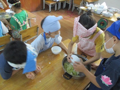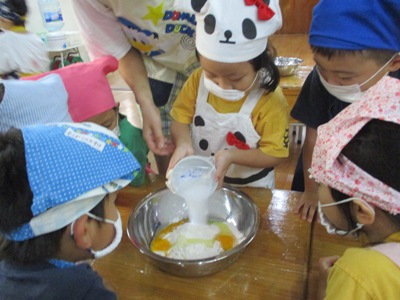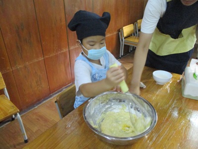 「さつまいもあん どらやき」を作りました。 まずは材料のご紹介です。 生地★ ホットケーキミックス240g 砂糖70g たまご2こ 牛乳200ml みりん30ml 油 あん★ さつまいも150g 牛乳35ml 砂糖40g 塩少々 作業工程を確認し、あんと生地を並行して作っていきました。 まずは、あんの仕込みです。 固いさつまいもも包丁に力を込めて、、、 猫の手でしっかり切っていきます。 さつまいもをお鍋で茹でている間に生地作りです。 ボウルに 粉、卵、砂糖 を入れていきます。 そーっとそーっと。 卵も上手に割れました! そこへゆっくりと生地の状態を見ながら牛乳とみりん!を加えていきます。 そしたらよーくまぜまぜまぜ。 さあ、いよいよ生地を焼きます。 フライパンを温めて、 おたま半分ほどに生地を入れたら トローっと流し込みます。 そーーーっとね。 焼いている間にまたあん作りに戻ります。 湯だったさつまいもをしっかりめん棒で潰して 牛乳、砂糖、塩を入れて優しくまぜ、少し加熱します。 さあ、出来上がった生地にさつまいもあんを詰め込んで、、、 つめつめ。 いっぱいいれよーっ できあがりー!!!! おいしーっい!! にこにこがあふれます。 特大の「さつまいもあんどらやき」を味わった子供達でした。 (もぐまる) ベトナム・ハノイの日系幼稚園 さくらHoaAnhDao幼稚園ホームページ |