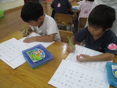 ![]() お着替えをし、布団を自分たちで片付けた後は、 お外に出て「ラジオ体操」と「おどるんようび」を踊ります。 係りの子どもは、みんなの前で 元気いっぱい踊りました ![]() 体を動かした後は、「朝ごはん」 メニューは、サンドイッチとふりかけおにぎりとジャーマンポテト ![]() 炭水化物の2品も、子ども達が考えたメニュー(笑) 歯磨きを終えたら、またまたお外に出て・・・ 「スイカ割り」です!! 教室の中で、お昼寝明けににせものスイカを使って 疑似体験スイカ割りを楽しんでいたみんな。 「ほんもののスイカだー!」「われるかなー?」とドキドキしながらも お友達の声を頼りに”エイッ!!” あれっ・・・!? じょうずにスイカに棒を命中させるお友達もたくさんいました。 最後のスイカは「先生頑張ってー!!」とみんなで応援 ![]() 4つのスイカ、全てが割れておいしくなかよく食べました ![]() 室内に戻った後は、わくわくさくらぐみを振り返り「絵日記」をかきました ![]() 「うれしかったこと」「たのしかったこと」 「おうちの人に伝えたい思い出」 なんのことにしようか~??と問いかけると 「おばけ屋敷!」「スイカ割り!」「キャンプファイヤー!」などなど 描きたいものが溢れだす子ども達でした。 絵日記の活動も終え お帰りの準備をし、お母さんたちの顔が見えると 思わず「ほっ ![]() みんなとってもよくがんばったね ![]() わくわくさくらぐみを迎えるまでの過程、 そして、親御さんと離れての2日間の活動を通して たくさんの成長と笑顔が溢れたさくらぐみさんでした ![]() ![]() 帰国のため、参加できないお友達もいましたが、 2学期も運動会や作品展をめざして元気いっぱい力を合わせて活動していきたいと思います ![]() (もぐまる) ベトナム・ハノイの日系幼稚園 さくらHoaAnhDao幼稚園ホームページ |
