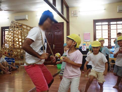 ながーいトンネルを作ってもらいました。 他のお友達のお父さんを見て、ちょっと緊張気味の子もいましたが、楽しく過ごすことができました。 《年少 なのはな組》 なのはな組はお父さんと一緒に絵画制作を行いました。 真っ白な紙の上に絵の具やクレヨン、スタンプや色紙と たくさんの素材を自由に使いながら思うままに描いていく というのが今回のテーマでした。 「なんでもいいよ」と言われると、大人は「何をかこうか.......」と 一瞬迷うのですが、子ども達はすぐにクレヨンや筆を片手に、 躊躇なく思いついたままに描き始めます。 それに引っ張られるように、お父さん達も少しずつ子どもの絵の上に 自分のアイデアを加えていきます。 こうして出来上がった親子の共同作品はどれも個性溢れる 世界に一つしかない素敵な作品となりました。 お父さんが描いたひまわりの上から、子どもが青の絵の具で 雨を降らせてみたり、公園を描こうとした我が子のアイデアを 膨らませて描き加えた一本の大きな木に、子どもが自分の 10年後の家にすると言って、窓や人を描き加えたりと、 面白い物語が紙の上に生まれていきました。 最後は、子ども達が大好きになった「みずあそび」の歌を 披露し、一生懸命歌う我が子の姿に成長を感じたという お父さんの感想をいただきました。 お父さんへのプレゼントの車の壁掛け。運転席には 子ども達が描いた大好きなお父さんが。そして、 その横にはやっぱりお母さん。 我が子からのプレゼントを見て、優しく微笑むお父さんの 表情が心に残りました。 《年中 すずらん組》 『おとうさんとあそぼう』をテーマに、すずらん組は、「いすとりゲーム」と「もうじゅうがりゲーム」をしました。 いすとりゲームは一般的なルールと違い、父の日バージョンとして、散らばったいすを囲んで、 子ども達が立って待ち、ピアノの音がなってる間、お父さん達がその外を走り、 ピアノの音が止まったら、自分の子どもを連れていすに座ります。 ハラハラドキドキで、自分の子どもを間違えそうになったりして(笑) おとうさんも子ども達も一生懸命な姿がとてもすてきでした。 もうじゅうがりゲームでは、お父さんチームや子どもチームが出来たりして、面白かったです。 最後は、お父さんが後ろを向いてもらいサプライズでプレゼント渡し! 布にペンキで子どもたちが描いた、《ランチョンマット》をプレゼントしました。 使うのがもったいないほどの作品です! お父さんも子ども達も笑顔で溢れた、たのしい時間をいっしょに過ごすことが出来ました。 《年長 さくら組》 男の子の多いさくら組の子たちは、体を動かすゲームが大好きです。 と、いうわけで、さくら組はお父さんと一緒にミニ運動会をしました! 一番最初の競技は玉入れ。 お父さんにかごをしょってもらって、逃げてもらい、子ども達が追いかけて投げ入れます。 けっこう本気で逃げてくれるお父さん。でも、子どもたちもお父さんもとっても楽しそう☆ 帽子と帽子をひもの付いた洗濯バサミでつなげて親子で走る、”親子の絆”や、 親子競技の定番、デカパン競争、 オセロのような丸を自分のチームの色にひっくり返す”ひっくりかえしゲーム” などなどのゲームをしました。 出番を待つふとしたときに、お父さんの膝の上に座っている子どもの姿が。 そのにんまりとした表情に、お父さんとの時間を過ごせて嬉しいのだなぁと微笑ましく思いました。 最後に、お父さんへのプレゼント。 牛乳パックに折り紙で切り貼りをした小物入れを作りました。 縞々になるようにデザインを考えて貼ったり、この色がいいと自分で選んで作ったプレゼントです。 プレゼントが見えないように後ろに隠しながら、”すてきなパパ”の歌を元気な声で歌った子どもたち。 「おとうさん、ありがとう」と渡します。 子どもたちが工夫してつくったプレゼント、ぜひ使ってあげてくださいね! ベトナム・ハノイの日系幼稚園 さくらHoaAnhDao幼稚園ホームページ |