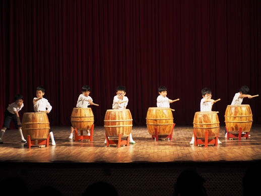 この日のために、各クラスで取り組み、見事な姿を一人ひとり見せてくれました。 一年間の子ども達の成長が、しっかり詰まった素敵な発表になりました。 毎年、発表会のオープニングは、さくら組(年長)の太鼓です。 今年は、太鼓に踊りをミックスさせた、≪ソーラン節≫を見せてくれました。 たくさんのお客さんに、少し緊張した表情ですが、さすがさくら組。 素晴らしいスタートになりました。 プログラム1≪異年齢グループ~絵画遊び~≫ 異年齢グループとは、全園児が2つのグループに分かれて、 (自分の好きなグループを選びます) 小さなお友達と大きなお友達が一緒になって発表します。 絵画遊びグループは、テーマをふたつ決めて、思い思いに描いていきました。 小さなお友達もしっかり筆を持ち、ダイナミックに表現し、 その隣に、お兄ちゃん達が描き加えていったり、またその上から、違うお友達が描いていき、 一つのものが出来上がりました。 洋服が汚れないように、カッパを着て描いた子供達。 カラフルで、かわいいですね。 『お菓子の街』 『花火』 プログラム2≪なのはな組(年少)歌~とけいのうた・おなかのへるうた~≫ 2つの歌を合わせ、フリ付きで歌い、大きな声がホールに響き渡りました。 プログラム3≪すずらん組(年中)劇~くじらのだいすけ~≫ 長いセルフもよく覚えました。 少し恥ずかしい気持ちも出てくる年齢ですが、最後までしっかり発表することが出来ました。 取り組みを積み重ねた姿が現れていました。 プログラム4≪さくら組(年長)鍵盤ハーモニカ~ふるさと~≫ さくら組になって初めての活動の集大成でもあった、鍵盤ハーモニカ。 早くなったり、指使いが難しいところもありましたが、 それでも、一年間取り組んできた頑張りが出ていました。 ハノイで聴くふるさとに、じーん・・・ プログラム5≪いちご・もも組(年年少)劇~のせてのせて~≫ 一番小さなクラスのお友達です。 大きなステージの上に立つだけでも立派な子ども達ですが、お母さん、お父さんに手を振る姿や、元気に発表する姿は、本当に微笑ましかったです。 『ストップー!のせて、のせて』と言う、セリフが、ホールに広がりました。 プログラム6≪異年齢グループ~わらべうた遊び~≫ お兄ちゃん、お姉ちゃんが小さなお友達とペアーになり、助け合ったり、 一緒に歌ったり遊んだりする姿は、微笑ましい様子だったと思います。 遊びをアレンジし、みんなで楽しむことが出来ました。 プログラム7≪なのはな組(年少)劇~おおかみと7匹の子ヤギ~≫ 一人ひとりの声が良く聞こえて、この年齢ならではの素の姿を見せてくれました。 みんなでいっしょに言うセリフの前には、『せーの』と、大きな声で言ったりして、 のびのびと発表していました。 おおかみのお腹に詰まった石で、お腹が膨れているの分かりますか? プログラム8≪すずらん組(年中)合奏~ねこバス~≫ ダンスと合奏を発表しました。 ピアノを聞く、リズムを合わせるなど、自分ひとりではなく、 みんなと気持ちを合わせてしっかりと発表することが出来ました。 プログラム9≪さくら組(年長)劇~ともだちや~≫ 最後を締めくくるにふさわしい発表になりました。 とにかく、笑顔あふれ、一人ひとりが楽しんでいる姿がしっかりと現れていました。 クラスみんなで力を合わせた、素晴らしい劇になりました。 エンディング~きっと~ 全園児がステージに上がり、みんなで歌いました。 一人ひとりの声がしっかりと広がり、みんなで一緒に作り上げた発表会が現れていました。 三学期から始まった取り組みでしたが、この活動を通して、一人ひとりが大きくなり、 自信につながっていきました。 保護者の皆様の、ご理解ご協力に感謝です。 これからも、子ども達のぐんぐん大きくなっていく姿をたのしみにしています!! ベトナム・ハノイの日系幼稚園 さくらHoaAnhDao幼稚園ホームページ |