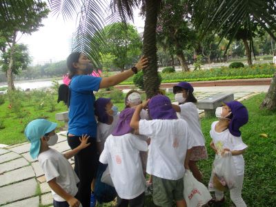 公園について最初に目に飛び込んできたのは、トラのオブジェ!!! 『あーートラがいる!』と大喜びの子どもたち、さっそく近くまで行ってみることに。 「わーおっきい!」『ピンクのトラもいるー』と大喜び。 それから馬やちょうちょなどのオブジェを見て歩いていくと、今度は噴水を見つけました。 真ん中の水が高く伸び、それをみた子どもの口から、 『うわぁーークリスマスツリーみたい!』 小さくなると、 『クリスマスケーキみたい!』 噴水の水の動きが変わるたびに、大喜び。 すると、少し風もあり噴水の水飛沫が飛んでくると、 『きゃー冷たい』『お水がきた!!』とこれまた大喜び 噴水を見るだけでも楽しく過ごせそうなほど見入っていましたが、今日は電車に乗るために来たので、電車と駅を探して、 見つけました!!ハノイ駅。 電車も止まっています。『電車いたーーー』と嬉しくてたまらない様子でしたよ。 電車がホームに入ってくると、目をキラキラさせて、わくわくが溢れていた子どもたちでした。 電車が動くと、『動いたー』『速いねー』と言っていました。 すれ違う人たちに、『バイバーイ』とたくさん手を振りましたよ。 すると電車が、止まり、さくら・すずらんぐみさんはサイゴン駅で降りて公園散策へと出かけました。 お兄さん・お姉さんに何度も何度も『バイバーーイ』と手をふりお別れしました。 いちご・もも・なのはな組は、公園を1周して、ハノイ駅に戻って来ましたよ。 きりんのオブジェや、メリーゴーランドをみてお弁当を食べるところまで歩きました。 途中でお魚がいっぱいいる建物を見て、 そして、今日は外でお弁当を食べました。 『みてみて〜』『わぁー』とお弁当のふたを開けるたびに嬉しそうな声が聞こえてきましたよ。 お友だちと同じものがあるのも嬉しそうです。 『一緒だよー』という声も聞こえてきます。 食後は、公園に落ちていた大きな葉っぱ拾いをしました。顔が隠れるほどの葉っぱに大喜び!! 『葉っぱかいじゅうだーーーーー』 と広場を走り回り、まだまだ元気な子どもたちです。 バッタやカマキリ、セミの抜け殻も見つけました。 もっと遊んでいたかったけれど、帰る時間となり後ろ髪を引かれながら幼稚園に帰りました。 どんな些細なことでも楽しくなり、遊びに変えていく子どもたち、帰りのバスでは拾った葉っぱを大事そうに持ち、電車が楽しかった〜〜とお話をしてくれました。 また遊びに行こうね!! |
