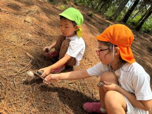 年中すずらん組、年長さくら組 遠足で、BanRomに行きました! 特別な大型バス✨に乗り込みさらにワクワクで出発進行!! バスの中でもインタビューをしたりクイズをしたりして大盛り上がり! 荷物を置いたら、まずはみんなでレクレーションをしました♪ 【ボール運びリレー】力を合わせて。ボール落とさないでね! レクレーションをたくさん楽しんだあとは、お山探検や動物さんの観察へ... お山では、松ぼっくりやきのこを見つけました