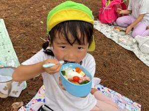 「この木、揺らすと上から雪みたいのが降ってるよ!」「本当だ!雪まつりだ~!」と、何度も揺らしては舞い落ちてくる小さなお花に大喜びでした♪ 次は、お待ちかねのお弁当の時間です! みんなでレジャーシートを広げ、木陰の下で、特別感を味わいながら食べることができました お弁当を食べた後も遊具でたっぷり遊んだすずらん・さくら組さん! さくらっこのお友達、これからも楽しい思い出をたくさんつくっていきましょうね♪