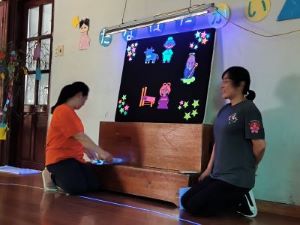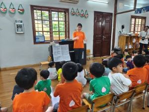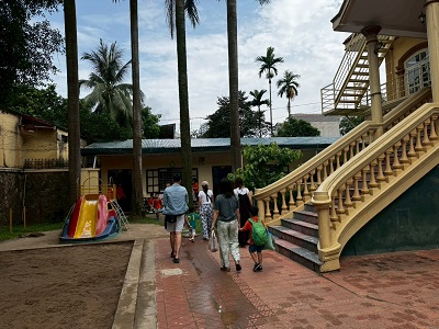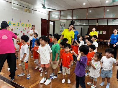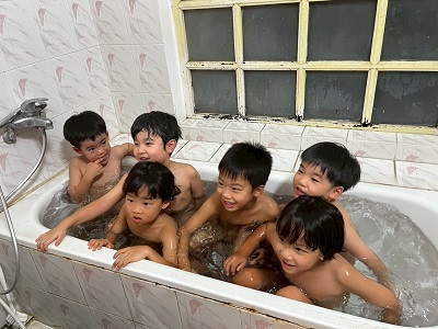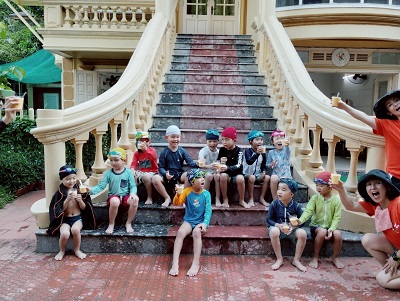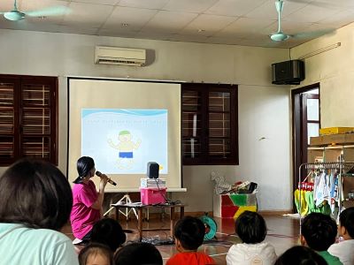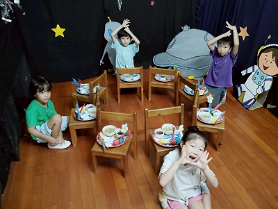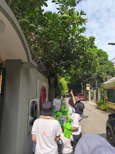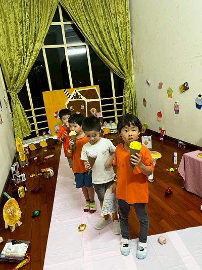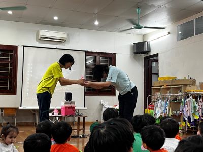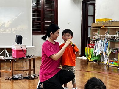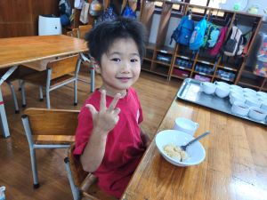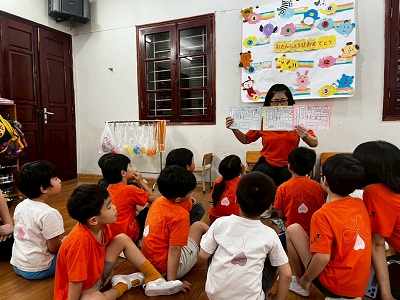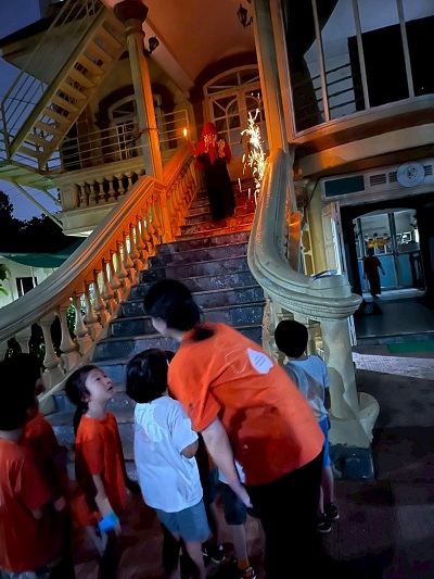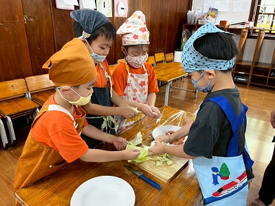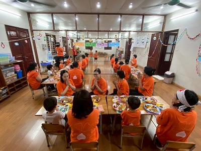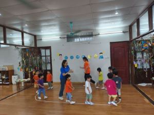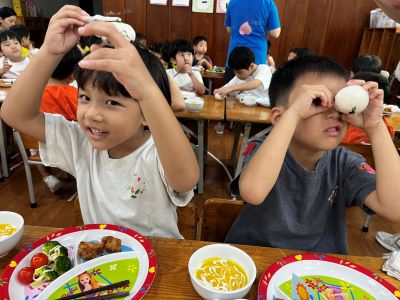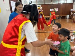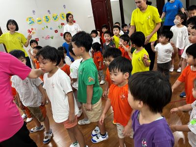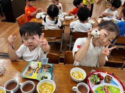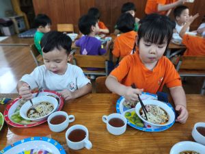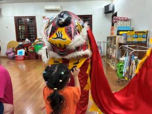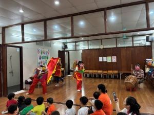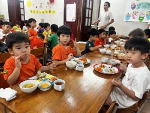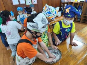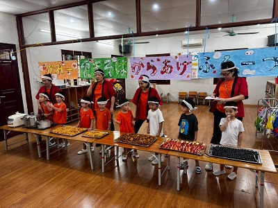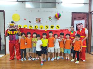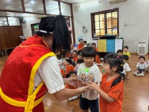 全員でホールに集まってお楽しみ会スタート! 中秋節は、ベトナム語で「テット・チュン・トゥー(Tết Trung thu)」と呼ばれ、旧暦8月15日に毎年行われるお月見の風習です。今年は10月6日が当日のようです。 元は中国から伝わったそうで、その時期になると、満月にお供えをして豊作の感謝をした後に、月光の下で料理を囲みながら宴会を行うようになりました。 ベトナム語の歌ですが、年長や年中組はよく覚えています! 楽しそうな歌を聞きつけてか、ししまいやと愉快なテフお姉さんが登場☆彡 豪快な太鼓に合わせて、華麗な舞を見せてくれました。 ししまいの迫力に、驚き泣いてしまうお友達もいましたが……ししまいに頭を噛まれると、幸運や健康に恵まれると知った子は、はりきって自分から近寄る姿もありました! そして、ししまいさんから子どもたちへ、Den Ong Sao(お星さまのランプ)をもらいました。 「ありがとう!」としっかりお礼が言えて、素敵でした 続いて各クラスで写真撮影。ししまい、愉快なテフお姉さんも一緒です! ひじきごはんやクリームコロッケ、みんなで美味しく食べました! 中秋節のお楽しみはまだまだ続きます! お昼寝後には、年長と年中組で、お月見団子のクッキングをしました。 おだんご粉と水を混ぜて、こねて丸めて~~ 「粘土みたい!」「大きいの作ったよ!」と、楽しむこどもたちです♪ その場で茹でるところも見学し、仕上げにきなこをかけて完成。 出来立てのモチモチおだんご、すごく美味しかったようですぐに完食! 「おうちでも作りたいな~」と、話す子もいました ベトナムならではの華やかな中秋節のお祝い。 お楽しみ会やランチ、クッキングなど、盛りだくさんで楽しみました♪
