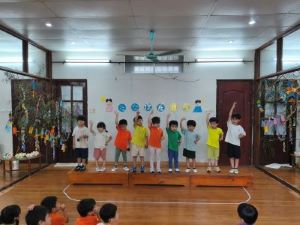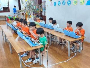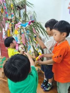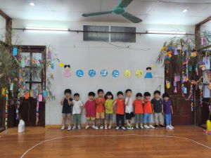 2、3日前から、笹の葉に短冊や飾りを付けて準備をしていました♬ ホールに全園児で集まり、お楽しみ会スタート! 「たなばたさま」のお歌を、お空の彦星と織姫に届くように歌いました♬ 先生からのお楽しみ、ブラックパネルシアター✨ 暗闇の中で光る幻想的な雰囲気に、子どもたちも釘付けでした! 続いて、子どもたちの発表! トップバッターは、すずらん組さん。 「きらきらぼし」に合わせてカスタネットを演奏しました。 次は、なのはな組のリトミック。ピアノに合わせて、うさぎやかえる、カメなどになりきり、元気いっぱいの姿を見せてくれました。 次は、いちご・もも組さん。わらべうた「くまさんくまさん」と、手遊びうた「てをたたきましょう」を振り付きで歌いました。“笑いましょう~ ワッハッハ~♪” のところなど、表情豊かに表現する子どもたちでした! ラストを飾るのは、年長さくら組さん! 鍵盤ハーモニカで「きらきらぼし」を弾きました。お客さんの前でちょっぴり緊張した子もいるようですが、素敵な演奏を届けてくれました☆彡 最後は各クラスで写真撮影。 両端の笹には、子どもたちの短冊や手作りの飾りが付けられています。そんな思いのこもった七夕飾りとともに、はいチーズ♡ 最後はみんなでごはんの時間「ねがいをかなえて たなばたランチ」 そうめんに、星型のハムやチーズ、たまごが飾られていました☆ 異年齢の縦割りチームで、仲良く美味しく食べました。 雨季真っ只中のハノイ。最近は雨や雷の日が続いていました。 果たして、今年の七夕には彦星と織姫が出会えるでしょうか...♡ そして、さくらっこたちの願いも叶いますように! インスタグラムでも、日々の様子が見られますので、そちらもご覧下さい!!#avo |