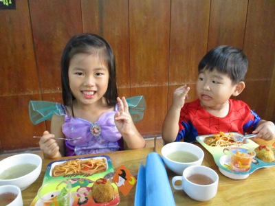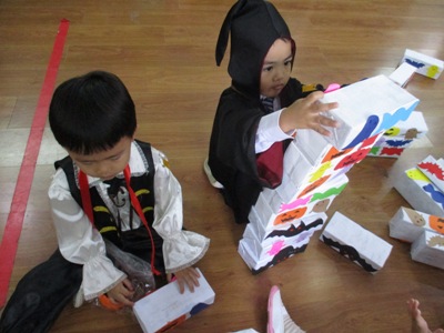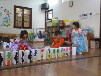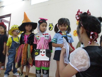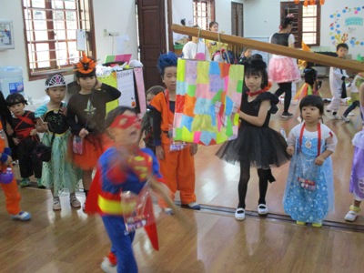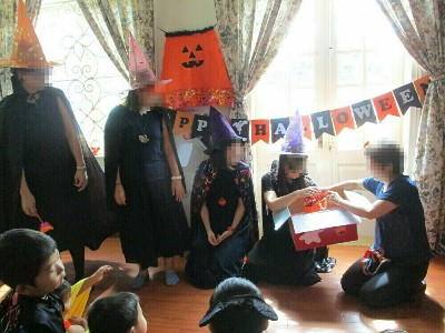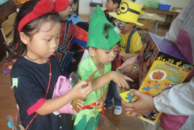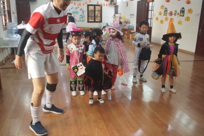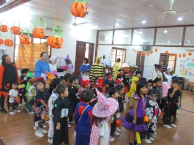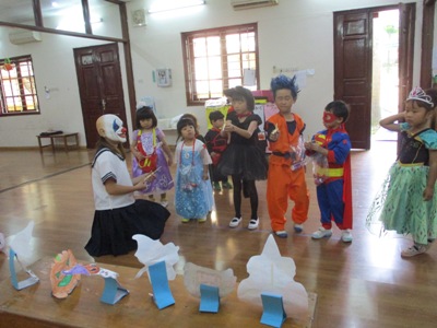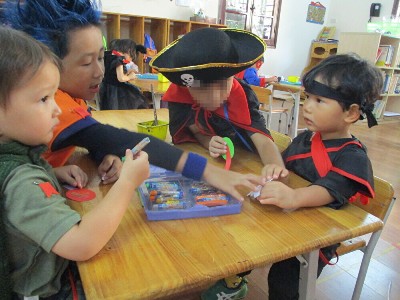 朝から元気いっぱいに子ども達と、保護者の方が登園されて、、 「わぁぁー!!すごーい!」 「えっ?!今年は何ですか?!」「…おもしろーい!…」 と、、けっして『かわいいー』と、言われることが無い、、職員の仮装です が、毎年わたし達職員の気合の入った仮装は、きっと! 楽しみにされていると思います もちろん!! わたし達職員も、さくらっこ達がどんな仮装で変身してくるのか とっても楽しみにしていました◎ かわいいー 連発の姿で、たのしいお楽しみ会がスタートしました 今年はみんなでハロウィンハロハロウィンウィンウィン ハロウィンの歌も歌いました。いつでも、どこでも歌ってい歌でした ハロウィンの由来や、各クラスの製作の作品を見て、 異年齢児グループごとに仮装を紹介してくれました。 小さなお友達も、しっかりなりきっていましたので、みんなに教えてくれました さあ!お楽しみ会メインのスタートです 各コーナー遊びを思う存分たのしみました 大きなお友だちに大好評で、何度もチャレンジしていました 高く積み上げたり、倒れないように楽しい形を作っていました。 また、綺麗に並べたりして、長いドミノを作っていました。 いろんな遊びを考えて、遊びを広げていました。 異年齢でいろんな遊びが広がり、元気な声が広がっていました 当たると、大きなお友達も一緒に喜んでくれました。 最後は、 えいっ!と、力いっぱいに、袋を破ろうとしていました 小さなお友達も先生と一緒に頑張りました お菓子ももらえて、楽しいゲームコーナーでした 小さなお友だちの製作を、自然にお手伝いする姿や、 「みてみて!」と言って、学年は違っていても笑い合う、仲良しな姿も見られました。 最後のお菓子をもらう時にばっちり「トリックオアトリート」と言って、 ハロウィンせんべいをもらいました 毎年、来てくれる魔女さん達が今年も遊びに来てくれました みんなでクモを探します。あちこちに隠れていたクモを大発見できました みんなでおまじないをかけると・・・あら不思議!!お菓子が出てきました★ やったー 保護者の方が読んでくれる紙芝居は わくわくいっぱいで聞いていました 可愛い飾りつけも、ありがとうございます。 毎年保護者の方に、協力して頂き楽しく会を開くことができています。 子ども達も、「〇〇ちゃんのお母さんがいたねー」「ママ…??」 と、一緒に子ども達の楽しみを作り上げていただき、本当にありがとうございました。 最後のお楽しみランチ グループのみんなで美味しくいただきました しっかり遊んだ後の、お楽しみランチはやっぱりおいしくて、 もりもり食べていました 一年に一度のハロウィンのお楽しみ会 「また明日もドレス着ていく?」と、お母さんにお話したお友達もいたそうです それだけ、しっかりたのしく過ごせてよかったです 思い出がまたひとつ増えましたね #082 ベトナム・ハノイの日系幼稚園 さくらHoaAnhDao幼稚園ホームページ |
