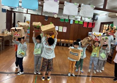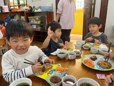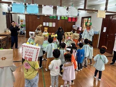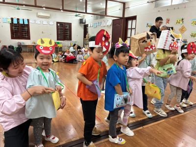 はじめに、豆まきの歌をみんなで歌ったり… 節分の由来を聞いたり… 各クラスのお面紹介もしました。 そして、子どもたちが、楽しみにしていた豆まきスタート!!! 小さいお友達が泣かないように...と、今年も優しい年長さんが鬼役をしてくれました。 おにはそと~ ふくはうち~ 鬼「降参~!!!」 「こわいよぉ~」と言いながらも、必死に豆まきをしている姿がとても可愛らしかったです。 終わってからは、みんなで豆ひろい競争!!! お部屋があっという間に、綺麗になりました。 最後にクラス写真を。 「はい、ちーず」 お楽しみランチは「豆まき節分ランチ」 みんなで食べるごはんは、おいしかったね! #pinkちゃん Instagramでも日々の様子をご覧いただけますので、ご覧ください。 ベトナム・ハノイの日系幼稚園 さくらHoaAnhDao幼稚園ホームページ |