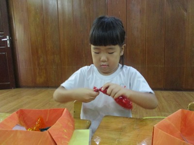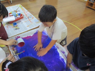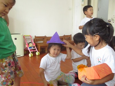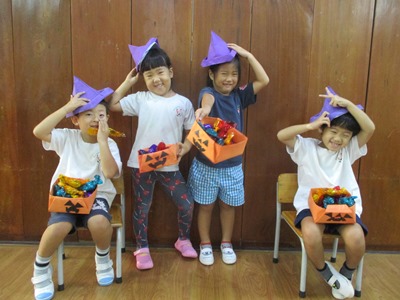 すずらんぐみではハロウィンを楽しもうと、製作をしました。 今年はかぼちゃのキャンディーボックスを作りましたよ まず最初に大きな折り紙を作るために、模造紙に色を付けました。 2つ目は、青と赤を使ってむらさき色に混色してオリジナルの色を作りました。 色が混ざって変化していくのを楽しみました 絵の具が乾いたら、折り紙の大きさにカットし、 オレンジ色は箱を、むらさき色は帽子をそれぞれ折りました。 いつもより大きい折り紙に子どもたちは、『えぇ?!こんなに大きいの??』『たいへん』と言いながらもその表情はどこか嬉しそうにしていました。 模造紙は折り紙と違って硬いので折り線をつけたり追ったりするときは 完成すると嬉しっくて帽子や箱をかぶったりしています 最後に、箱の中に入れるあめちゃんと、かぼちゃの顔を画用紙で作ったら完成です!! 出来上がったことが嬉しくって早速他のクラスのお友だちに見てもらったり、 お楽しみ会当日は各クラスのハロウィン製作と幼稚園中のみんなが仮装をして楽しみます!! (きいろちゃん) |