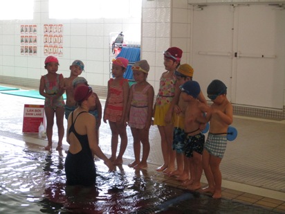色々なことが最後の活動になっています。 毎月のルネサンスのプールの活動も、この日で終わってしまいました。 「あぁー今日でさいごか。。」 と、さみしそうにしていましたが、それでもやっぱり園バスに乗り込むと、 嬉しくって「早くいこー!!」と、盛り上がっていました。 少し早く到着するので、イオンの周りを散歩して、「早く開かないかー」 と、待ち遠しい子ども達の様子がありました^^ すっかりルネサンスの先生にも慣れて、 元気にはじめることが出来ました。 各グループに分かれてスタートです◎ プールサイドで、バタ足の活動です。 みんな、先生の指導でしっかり手を伸ばして、 ばたばたと水しぶきを上げて取り組んでいました! こちらは、プールに向かってバタ足の活動です。 みんな上手に、できていましたよ◎ ビート板を使った活動です。 以前までは、顔を水につけて泳ぐのは少し怖かったお友達も、 今では『どうぞー』の先生の合図で、すーっと泳いで行く姿がありました。 プールを習っているお友達もいるので、 長い距離をすでに泳ぐことが出来るお友達もいます。 いつもとは違って、クラスのお友だちと泳いだりできるのは嬉しいようで、 何度も往復しても、笑顔で活動しています! このように、 一人ひとりに合った活動ができるので、 「出来るようになった!!」 「今日は、ここまでできたよ!」という気持ちが持てます。 そこはいいことですよね! 最後は、しっかりプールで遊んでたのしんでいます! 子どもたちも、先生としっかり関わることができて、 楽しい時間を過ごすことができていました! 終わった後のあいさつも、バッチリ出来ています◎ さくら組は最後の活動でしたが、 最後までしっかり楽しむことが出来て、自信もついて、 一ヶ月に一回のプール活動でしたが、いつもとは違う環境での活動で、 しっかり楽しむことが出来ました! 苦手だった子どもたちもいたのですが、 出来ることが増えていて、いい時間を過ごすことができました。 帰りは、お疲れのお友達もいたのですが なんと!! この日で幼稚園バスに乗るのも最後だったので、 子どもたち同士で、わいわい話しをしたり、 生活発表会での、他のクラスの劇遊びをしたりして たのしく帰りました。 (#082) ベトナム・ハノイの日系幼稚園 さくらHoaAnhDao幼稚園ホーページ |