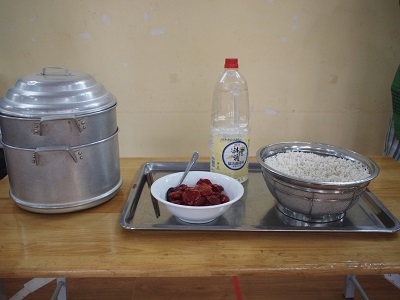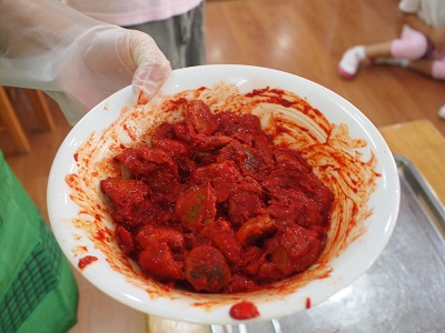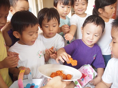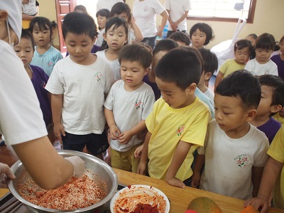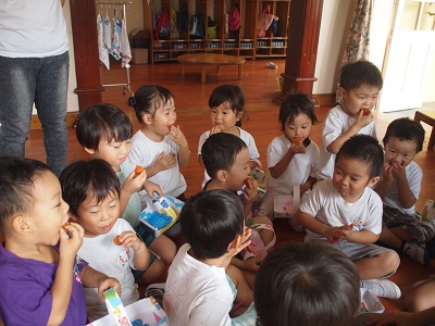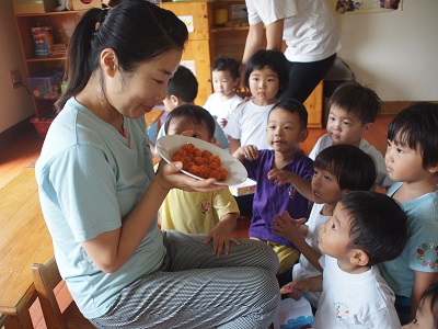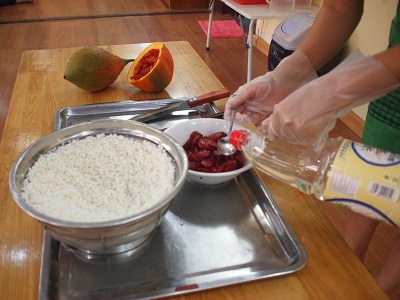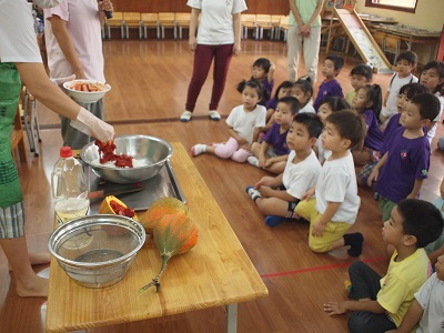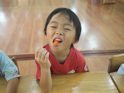 「xôi Gấc(ソイガック)教室」 せっかくの機会なので、全クラスがホールに集まって 給食の先生からお話しを聞きました。 まず、準備するのはこちら。 ●餅米(前日から水につけておきました) ●ガックの実 ●日本酒 ●蒸し器 ●砂糖 それでは、おこわ教室スタート☆ ①ガックの実に日本酒を少々入れて混ぜます。 混ぜていくと、赤い色がより鮮明になり 段々とねちょねちょとした粘着を帯びてきます。 ほら、こーんな感じ。 さくらっこ達も身を乗り出して見ています。 日本では見かけないこの果物。 それはそれは、子どもの心に鮮烈に残ることでしょう。 ②このガックを餅米に入れて、よく混ぜ合わせます。 じりじりと前に近づいてくるお友達。 「そうだよねぇ。もっと前でみたいよねぇ。」 ということで、順番に前に来て見てもらいました。 「餅米が赤くなってきたねぇ」 仲良く順番に、間近で見ることが出来ました。 ③よく混ざり合ったら、蒸し器に投入します。 ④蒸し上がったら、熱いうちに砂糖を加えて味を付けます。 これで、完成!! ガック自体にはあまり味がないので、砂糖を入れて甘くします。 緑豆を一緒に入れて食べることもあるそうですが、 今回はシンプルにガックと砂糖だけにしてもらいました。 ほんのり甘いおこわのお味はどうかな? 出来たてを、一口大に丸めてもらいさっそく各クラスで試食タイム♪ こちらは、年少なのはな組さん。 「できたよー。良いにおいするかな?」 あらあら、もう手が伸びてきそうですね(^^) 「1人1個ずつですよ。あら、2つくっついていたね」 「あーん。」なんだか、「おいしいね」の声が聞こえてきそうです。 年中すずらん組さんは、みんなで「いただきまーす」 年長さくら組さんはどうかな? 「ぼく、1口で食べちゃうよー」「えっ?どれどれ?」 「うーん、おいしい!!!」 ほんのり甘くて、幸せなお味でした。 まだまだ園庭にたわわになっているガック。 12月には、おやつで出すことにしました。 ベトナム独特の食材を使ってのおこわ。 実際に、実がなっているところ見て、それを収穫して、料理をする。 これこそ、大切な食育です。 いや、それが自然と出来るとは贅沢な学習ですよね。 自然の実りに感謝。 それでは、ごちそうさまでした・・・ (たこ) ベトナム・ハノイの日系幼稚園 さくらHoaAnhDao幼稚園ホームページ |