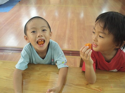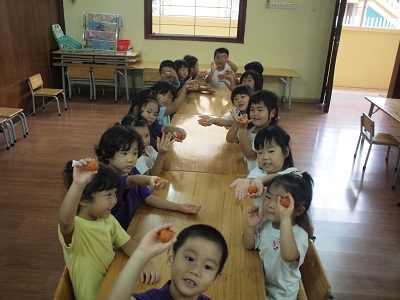 そこに、いくつもぶら下がっている緑色の実。 見えますか??? 「あれ、なぁにぃ~???」 と、毎日空を見上げていたさくらっこ達。 これは、gấc(ガック)という果物です。 今は緑のこの実。熟してくるとオレンジ色に変わります。 ガックは、ビタミンAが豊富に含まれており ベトナムでは大変ポピュラーな果物です。 餅米と一緒に炊いておこわにしたり、 ジャムを作ったり、スーパーではガックの油も売られています。 そんなガックが、ついにオレンジ色に色づき始めました。 各クラス、収穫してみまーす。 こーんなに高いところになっています。 こちらは、すずらん(年中)&さくら(年長)組さん。 口を開けたまま「じーっ」 こちら、なのはな(年少)組さん。 収穫できたとたんに、なぜか!?大歓声(^-^) 手を挙げて喜ぶ姿がなんともかわいらしいですね。 「ほーら、これがガックだよ。よくみると、まわりがトゲトゲしてるね。 みんな、触ってみてー!!」 「うわ~!!すごぉーい!!」 もも組(2歳児)のお友達の歓声が聞こえてきそうです。 こちらは、なのはな(年少)組さん。 慎重に持って、慎重に触ってみます。 さーて、どんな感じ? すずらん&さくら組さんも触りましょー。 「痛そうで怖いよぉー」と、おそるおそる。 持ってみたり、触ってみた後はいよいよ切ってみましょう。 じゃーん! 中身は、こんな感じで真っ赤な種がたくさん入っています。 指でつまんでみても、真っ赤になります。 この中身を見て「心臓みたい」「梅干しみたい」もう大騒ぎです。 しかし、心臓みたいとは・・・すごい発想ですよね。 さてさて、では匂いは? 「なんだか、良い匂い♪」「わー!くさいよぉ」「草の匂いがする」 で、このガックはどうするの? お当番さんが、給食の先生に「おこわ」にしてもらうようにお願いに行きます。 ベトナム語で言えるかな???ベトナム人先生と一緒にいってきます。 「よろしくお願いします。Xin cam on」 こうして、数日後給食の先生によるxôi gấc(ソイガック)「ガックのおこわ」 教室が開かれたのでした。 つづく・・・ (たこ) ベトナム・ハノイの日系幼稚園 さくらHoaAnhDao幼稚園ホーページ |