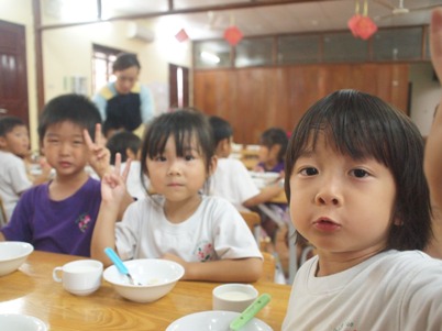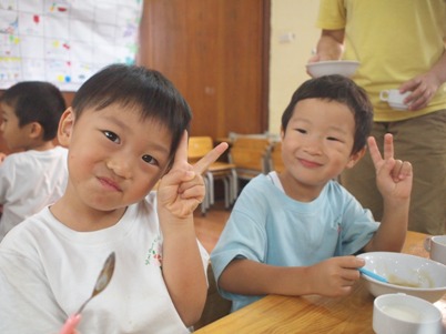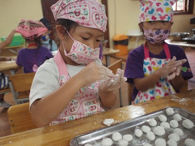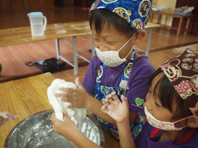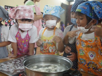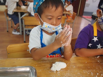 おたのしみランチを食べたり。おたのしみがいーーーっぱいの日中でした。 その最中もすずらんぐみの子ども達は「クッキングは?」の声が上がっていました。 午後1時半眠たい目をこすりながらも、「クッキングだぁ ![]() すぐに笑顔になりました ![]() ![]() おつきみだんご作りが始まりました。 ①団子粉に水を加え、スプーンで まぜまぜ… こぼさないよう、優しくかき混ぜることができました ![]() 白い粉がなくなったら、、 ②今度はこねます。 どのくらいまでこねるかな?『みみたぶ』くらいの硬さです。 手のひらを使って ぎゅっ~ ぎゅっ~ ![]() 力いっぱいこねて見せてくれました。 「みみたぶくらいだよ」「やわらか~い」「きもち~い」と手に持って触ってみたり 感触を味わう子どもたち。 「手がまっしろ~」と自然と笑みがこぼれます。楽しいね ![]() ③丸めていきます。 優しく包むように転がそうと 真剣な表情ですね。 自分で手加減して丸めるようになりました ![]() 「もうちょっと丸くかな。」「これくらいでおーけー」 いろいろとつぶやきながら、お友達と会話をしながら 楽しんでいました ![]() 次は ④お団子をゆでるところを見学 ![]() 「お団子が上にあがってきたよ!」と みんな釘付けで見ていました。 でき上がったおつきみだんごにみたらしをかけて 「おいしいーおいしいねー」とニコニコで食べていました ![]() ![]() 「おかわりー」と みたらし団子は大好評 ![]() 甘くておいしかったね ![]() (おはな) ベトナム・ハノイの日系幼稚園 さくらHoaAnhDao幼稚園ホーページ |
