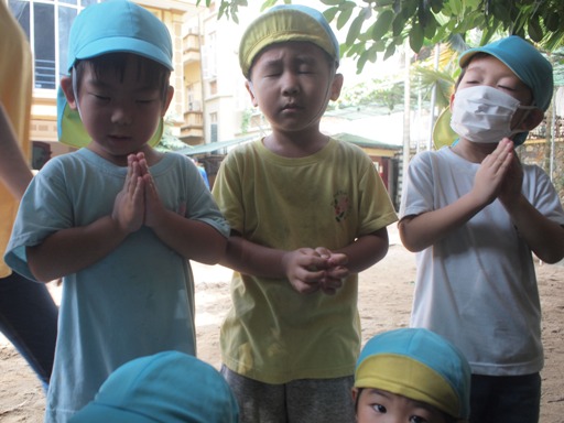 2匹?? と、いうことは、、、 そうです!! あたらしいお友達とは、 かたつむりの『かたちゃん』です◎◎ 最近、お当番活動をしていますので、 お当番のお友達が、順番で かたちゃんのお部屋を掃除したり、ごはんをあげてくれています。 これは、給食室に野菜をもらいに行った時の一こま。 「あっ!!うごいた~」 「きゃぁぁーにげちゃうよー」 「みてみて!目玉が飛び出した!!」 「遅いかと思ったら、はやく動くんだね~」 「うんちもしてるから、大きくなってるのかな?!」 「かわいいなぁ~」 「いっぱいたべないと、さくら組になれないよー」 などなど!! 子ども達の声が部屋中に、広がっています! しかし、、、 先日、一匹のかたちゃんが死んでしまいました。 実は一匹が行方不明になっていたのですが、 無事に見つけることができて、 戻ってきたのですが、弱っていたのが原因だと思います。 子どもたちにも、 勝手にお部屋からでたり、一人で行ってしまうと、 戻れなくなってしまうよね。と、お話をしました。 そして、園庭に埋めて、 「元気でね」 「もう、迷子にならないでね」 と言って、お別れをしました。 直接触ることはしないのですが、 見ているだけでも、子どもたちは、みんなの仲間だと思って、 活動前や、お昼寝後などの観察は、欠かさず行っています!! なかなかハノイでは、 生き物に触れることが難しい環境ですが、 このように、生き物を大切にする気持ち、 みんな同じように生きていることを伝えながら、 育つ心を、大切にしていきたいです。 (#082) ベトナム・ハノイの日系幼稚園 さくらHoaAnhDao幼稚園ホーページ |