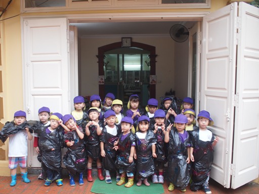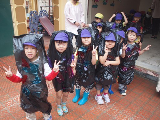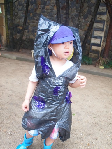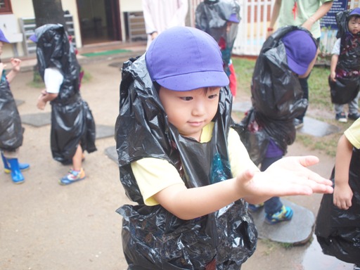 雨が降ると、がっかりすることが多いのですが、 子どもたちは朝から 「みてみて~!!このかさ可愛いでしょ!!」 「今日、長靴はいてきちゃった!!」 といって、いつもとは違う気分で朝登園できるので、うきうきな様子が見られています。 しかし、、、 外遊びができないので、 「あぁーはやく雨やまなかいなー。お外いきたいよー」 小雨になっているのを見て、「あ!もう、雨やんだよー」 といって、うずうずしている姿も見られていたので、 なのはな組(年少)は、ビニール袋のかっぱを作って あめ^^あめさんぽに行くことにしました。 ビニール袋に、手足、頭をくりぬいて、きらきらのテープを張って完成。 それではしゅっぱつです!! しゅっぱつしんこうえいえいえおー!! 長靴の友達は、水たまりの中に思い切って入ってみたり、 「カエルさんいるかなー」と言って、探していました。 あっ?!なんか聞こえるよーとお友達に教えてもらって、 耳をすましています。。。 「ほんとだーぽたぽたって頭に雨が当たる音がきこえるよ!!」 と、立ち止まって雨の音を聞いてます。 「雨触ってみる」と言って、 木のしずくを触ってみたり、手を出してみる姿も見られました。 本当に、子どもたちの想像は無限ですね。 素晴らしい感性に、雨の中でもほっこりしてしまいました。 いつもの園庭での散歩でしたが、雨の中さんぽするだけで、いろんな発見や発想があり、 また違った気持ちで散歩することができ、たのしんで過ごすことができました。 雨で残念な気持ちも、いっきにたのしい気持ちになりました。 さいごに、みんなで 『かわいいおかおで はいちーーーーず!!』 次は、何して遊ぼうかたのしみです^^ (#082) ベトナム・ハノイの日系幼稚園 さくらHoaAnhDao幼稚園ホームページ |