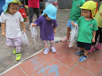 この間、いちごももぐみとすずらんぐみで一緒にお散歩へ出かけました すずらん組は初めて小さいクラスのお友達と一緒に出かけるので嬉しくもあり、 『一緒に(手を)繋ごう』と誘って出発しました。 園外に出ると、犬やお花、トラック、車!などいつもの活動中には見れない景色が広がり子どもたちも興味津々 すずらん組は『あっ!この前も見たね、あったね!』など前回のお散歩を振り返りながら歩きました。 今日は手に袋を持って落ち葉拾い 少し歩くと、きょうりゅうの足跡を発見!!!! その後は鯉を見たり、、、 後日、いちご・もも組さんは拾ってきた葉っぱで製作をしました。 (りんご・きいろちゃん) |