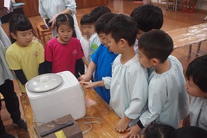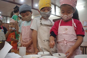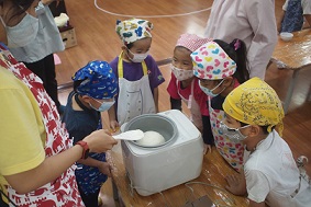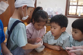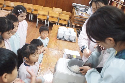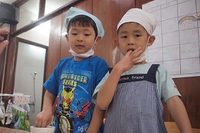 1月のクッキングを、すずらん組、さくら組合同で行いました。 1月は毎年、日本の行事を知る目的もあり、『おもちつき』です。 お餅つき機を使用していますが、 これは、卒園児の保護者の方から頂いた大事なもの。 毎年、このおもちつきを楽しみにしています。 まずは、お餅は<もち米>から作ることをみんなに話をして、 実際に見たり、においをかいだりして、機械に入れていきます。 どうなるのか、、、ドキドキの表情ですね! この日のお当番さんが、ボタンのスイッチを入れてくれました。 おいしくなーれ!の気持ちをいっぱいに込めています^^ 蒸し上がるまで、お正月のこと、本当のおもちつきの映像を見て、 「おっきい臼だね!」「たくさんの大人で作ってるんだね」と、 興味深々の様子でした。 さて!そろそろ出来上がる頃に、 エプロン、三角巾、マスク、手の消毒を済ませて準備オッケーです!! きなこと、砂糖醬油の味付けも子ども達が作っていきます。 お味はどうかな?! 「うん!ばっちり!」と、準備オッケーです◎ お餅も出来上がってきましたよー お米だったのに、あっという間に、まるまるとした白いお餅ができあがり 「ん~!!おいしそーなにおい!!」と、覗き込んでいました^^ なのはな組、いちご、もも組さんもやってきて、 びろーーん!!と、出てきたお餅にびっくりしたのと、 子どもたちの「やったー!」という声が、広がっていましたよ★ 一人一人に分けていくと、「あったかーい!」といって、笑顔があふれて、、 真剣にお餅を丸め始めました。 小さなお友達が食べやすいように、小さく、、、本当ちいさくして^^; 食べさせてあげてあげました◎ ちょうだーい!と言って、お兄ちゃんたちが丸めてくれるのを、 順番に待っている姿も、本当にかわいく、さくらっ子の良さがしっかりと表れていました◎ 自分たちで丸めた、出来立てのお餅は最高に美味しかったのがよく分かった、 1日になりました! 幼稚園全体で、何かに取り組んだり、 お兄ちゃん達の姿を見て、憧れる気持ちが持てたりできること、 今の時期、とても大切なことです。 これからも、たくさんのお友達と関わり、 ぐんぐん大きくなっていく子ども達を見守っていきたいと思います。 2月のクッキングも楽しみな子ども達です! ※インスタグラムでも、日々の様子が見られますので、そちらもご覧下さい!! |