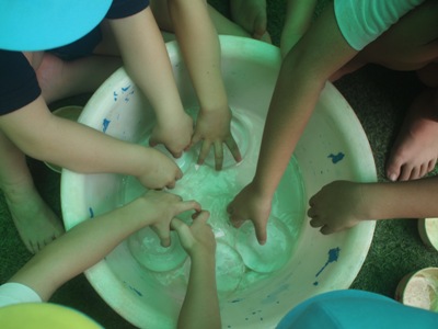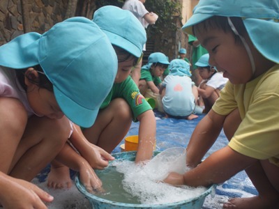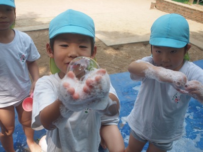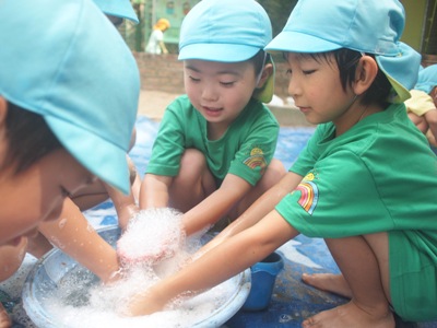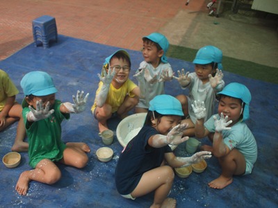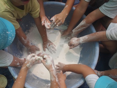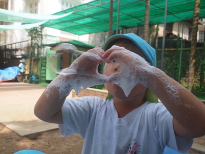 子どもたちは元気いっぱいで、夏のはじまりを楽しんでいます。 小麦粉とココナッツパウダーをまぜて、コネコネ! 子ども達で水を入れたり、粉を入れたりして、それぞれの粘土が出来上がりました◎ 手を真っ白にしながら、 ココナッツのいい匂いを感じながら、感触を楽しみました。 わぁーすごい!! 暑さで小麦粉がすぐに乾いてしまうと、、 「おばけだぞー!!」と言って、襲い掛かってきましたが笑 友達同士で、握手して着けあったり、ほんとにダイナミックに活動できました。 タライに寒天と水を入れて、ぐにゅぎゅにゅと感触遊び^^ いっしょに泡も入れて!!!ぐるぐる洗濯機ごっこをしてたのしみました。 わぁーまぜたらあわだらけー!! と、大騒ぎの声が園庭に響きわたっていました。 手についた泡をふーっと!! 大人が教えたわけではなく、自分達で「みてみてー」と言って、 しゃぼん玉を作り始めました! なんと!! かわいくハート 「いっぱいふーってするんだよー」とごきげんな表情で教えてくれました◎ 「みてみて!!泡の中に指が入った!おもしろーい」 と、子ども達自身で大発見★ こうやって、『みてみて』と、教えてくれることは、 大人にはない発想で、毎回ビックリさせられます タライに氷を入れ、そのまま氷を触ってしっかり遊びこみました。 「手が凍るほどつめたーい!!」 「冷たくてきもちがいいー!!」 と、暑いハノイには、やっぱりこれくらいの冷たさがちょうどいいようです 「ちょっとうしろむいて。。。」 「ぎゃーーーー!!!」 背中に氷を入れたりして、すっごい楽しんでいる子ども達! 言葉で表さなくても、子ども達の表情で、どんなことを感じて想っているのか すぐにわかりますね◎ 最後は、タライの水をまき、片付けまでできました。 まだまだ、これから暑くなってプールも始まってきますが、 その前に、広い園庭でしっかりと遊びこみ、 のびのびと友達と一緒に大きく育つ子ども達を、これからも見守っていきたい思います。 (#082) ベトナム・ハノイの日系幼稚園 さくらHoaAnhDao幼稚園ホーページ |