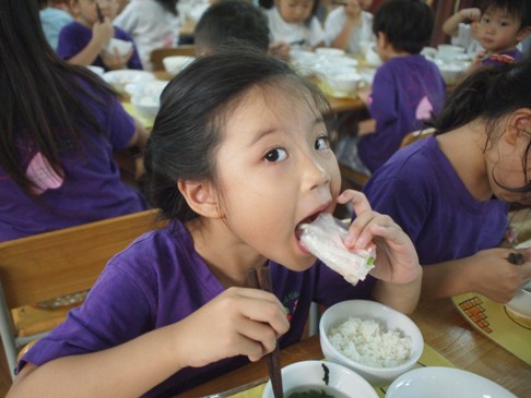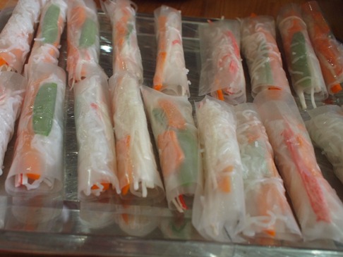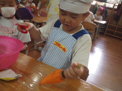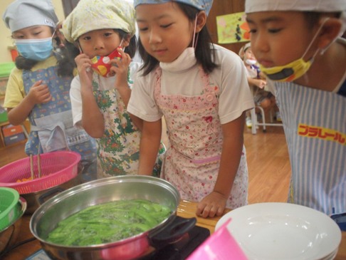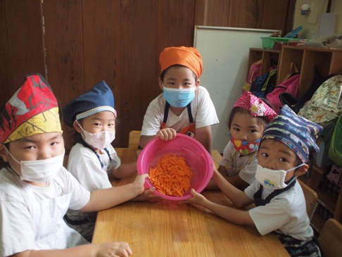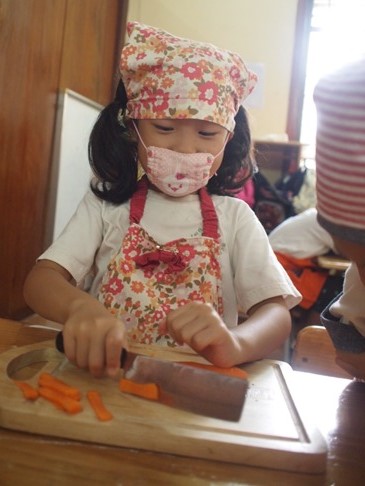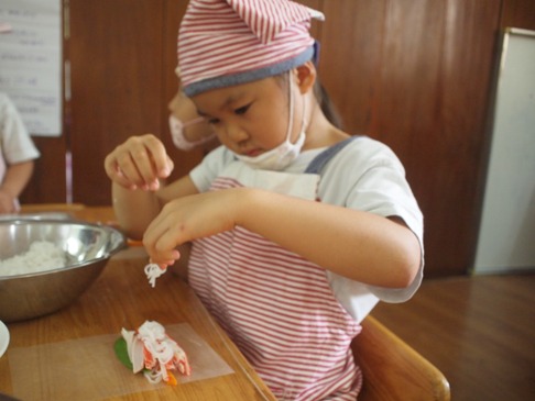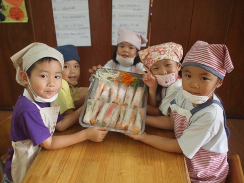 どどーーーん!!と、今日はベトナムの代表的な料理、生春巻きを、年長さくら組で作りました。それでは、クッキングはじまりでーす。 ![]() まずは、にんじんの皮をむきましょう。 葉っぱの茎をぐっと握って、ピーラーでむいていきます。 皮がむけたら、人参を千切りにしていきましょう! ちょっと太くなっても大丈夫! 茹でるのでやわらかくなりますよ。 ちょっと硬かったけれど、みんなで力を合わせて切りました! がんばったーーーーー ![]() おつぎは、さやえんどうのすじを取ります。 爪をうまく使って、ぽきっとおるのが なかなかむつかしそうな子ども達。 子どもの頃、よくお母さんのお手伝いでやりましたよね。 さやえんどうも、しゃきっと歯ごたえが残るくらいに 茹でておきましょう! 「なんだかいいにおいがするーーー ![]() さあ、下ごしらえができたら生春巻きの皮に巻いていきましょう。 今回は、細く割いたカニカマと、ベトナムの麺でブンという お米の麺を茹でたものを一緒に巻いていきます。 ブンが手に入らない場合は、おそうめんを代用しても 良いかもしれませんね。 彩のよい野菜は最初ににおいて、最後にブンをおいたら、 くるっと巻いていきましょう! じゃーーーーん!!!生春巻きの完成でーす!![]() 子ども達も、「やったぞー!」のこの嬉しそうな表情です。 生春巻きは、タレを付けて頂きます。 タレの材料はこちらです。 (材料) 水 50cc ヌクマム 6cc 酢 5cc 砂糖 12g 塩 少々 それでは、さっそくいただきまーす! ぱくり!!!素材の味が感じられる、やさしい味です。これなら、いくらでも食べられそう!! ぜひ、ご家庭でもお試しあれ。 ![]() ベトナム・ハノイの日系幼稚園 さくらHoaAnhDao幼稚園ホーページ (まんごーさん) |
