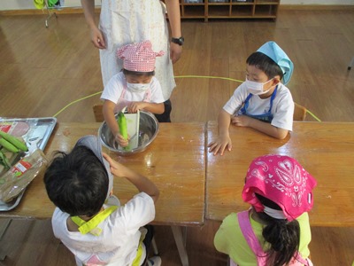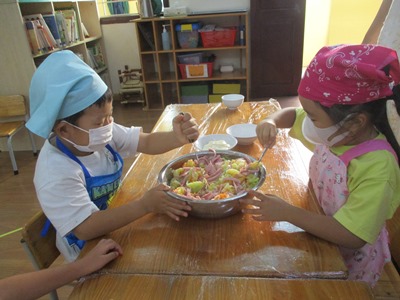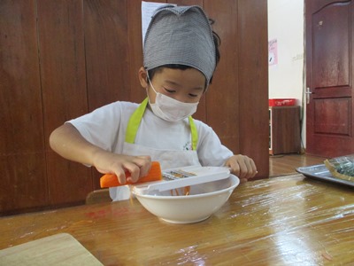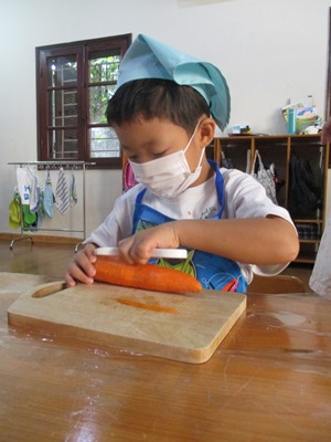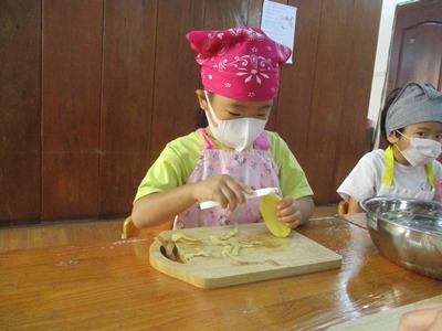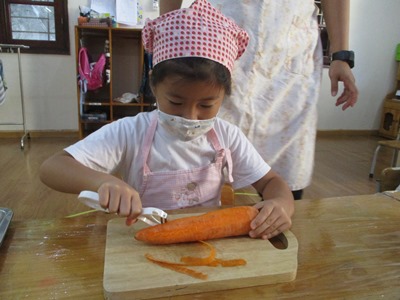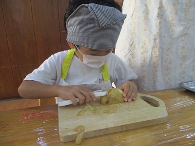 10月のすずらん組のクッキングは“ポテトサラダ”です 子どもたちには以前から伝えていたこともあり、とても楽しみにしていて、 『明日は皮をむくんでしょ?!』とわくわくしていました 道具の紹介と使い方と使い方を話していざ挑戦です!! 最初は使ってみたくてたまらなかったけれど、実際に手に持ってするときはドキドキしていましたよ。だけど、1・2回ピーラーで皮を剥くと楽しくなりどんどん剥いていきました。 2回、3回と回数が増えるたびにどんどん上手になってきて、『あっここも皮がある!』といって気にかけ、どんどん剥いていってくれました スライスするとどんどんボールの中にきゅうりやにんじんが溜まっていくのをみて、スライスすると全員必ず、『ねぇねぇ(ボールの中)見せて〜〜 野菜を切り終え茹で上がったら、あとは野菜を全て混ぜて最後に調味料を混ぜて完成です!!! 自分たちで作ったポテトサラダは格別〜〜 たくさんおかわりをしてたべました 11月のクッキングも楽しみにしていてください |