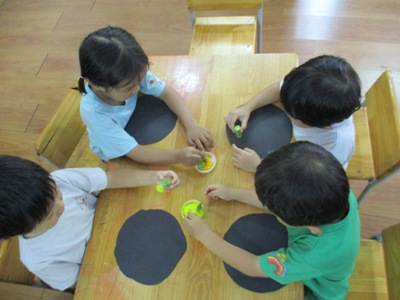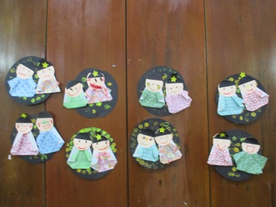 「さ~さ~の~は♪さ~らさら~」と、元気に歌う声が広がっています。 もうじき7月の行事 すずらん組(年中)でも、 すずらん組は、壁飾りを作りました 織姫と彦星の服は、千代紙で折っていきました。 少し難しかった様ですが、丁寧にゆっくりと折ると、 「1つできたらもうわかったー!!」と言って、 次には自信をもって折る姿もありました できるようになって、嬉しい表情が輝いています 顔は、事前に丸を描いてあった画用紙をはさみで切っていきました はさみの使い方も上手になり、真剣な表情がかっこいいですね いつもは、賑やかで元気いっぱいのクラスですが、、、 このときは、、、しーん、、、 「なんか静かだね」と、子ども達が言うほどです 可愛らしい表情はクレヨンで描きます。みんな優しい顔をしていますね 台紙の黒の画用紙も事前に丸を描いてあるところを切って、 そこに、、、 夏野菜の『オクラ』を、野菜スタンプしました。 子ども達には、 「これは、大事な食べるものです。でも、今日はこれでお星様を作っていきます。 大事な食べ物だけど、こうやって使うことにも感謝しようね」 と、話しをしました。 「なんだか、チクチクする。」「こっちは硬いのに(皮)、ここは(中身)ふわふわ!」 と、オクラのスタンプですが、オクラの触感も感じることができました 今度、いろんな野菜を触ってみようね のりで貼って完成です みんなの素敵な作品ができ曲がりました 七夕会では、各クラスで出し物をします すずらん組も発表の活動を取り組んだり、「ちょっと難しいけどやってみよう」と言う、 チャレンジする気持ちも育っています また、子ども達の様子をお伝えしますので、楽しみに待っていてください #082 ベトナム・ハノイの日系幼稚園 さくらHoaAnhDao幼稚園ホームページ |