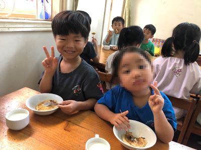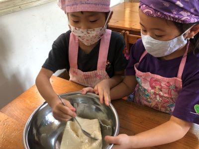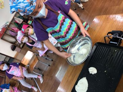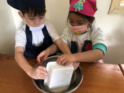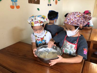 子ども達は毎日元気いっぱいに、ハノイで過ごしています☺ 10月から始まったクッキングの活動。 毎月とっても楽しみにしている様子が見られて、いろんな経験を積み重ねる大切さを 感じています。 2学期最後のクッキングは、【豆腐のパンケーキ】を作りました。 作品展で『お菓子の世界』を作り上げた子ども達でしたので、 【パンケーキ】と聞いて、大喜び!! 作るだけではなく、食べることが出来る☆ しあわせぇぇ~!!と、言って喜んで作ることが出来ました◎ ①豆腐をつぶす 今回の豆腐をタッパーから出してボールに入れていきます。 全然においしないね。。といって(;^ω^) スプーンでつぶしていきました。 たしかに、、いつも「なんかにおいする!」と言って、 作るだけではなく、においも楽しみにしている子ども達ですので。。 ちょっと、残念そうでした!(^^)! ②小麦粉、砂糖を入れて混ぜる ボールをお友だちが持ってくれて、 みんなで作り上げている様子がいいですよね◎ しっかり混ぜていくと、生地がふわふわしてきて、 「なんか、ぷるぷるしてるー!「おもしろーい!」と言って、 目で見て楽しんでいました! 最後はもちろん! 「おいしくなーれ!おいしくなーれ!」と、大事なおまじない!!をかけてくれました◎ 午前中の活動はここまで。ぐっすりお昼寝をして、、、 ③バターを塗って、ホットプレートで焼く 冷蔵庫でねかせた生地は、、少し固まっていて、、 「なんか、プリンみたい( ´∀` )」「さっきと違うよー」 と、ちょっと心配していた子どもたちもいましたが(^_-)-☆ もう一度、クルクル混ぜて焼いていきました。 「あっ煙が出ているよー」と、小さな気づきを友達と共有したり、 「なんか、音が聞こえてきた」と言って、みんなで静かに耳を傾けてみたり、 そして、、 「わぁー!いい匂いしてきたー」と大喜びして!! この時間が一番大騒ぎでした((*'▽') その気持ちわかりますね! ④はちみつをかけて完成 たくさんのはちみつをかけて(;^ω^)出来上がりを喜び、 おやつの時間にもりもり食べて、「おいしー!」が止まりませんでした◎ 自分で作った【豆腐パンケーキ】大成功!! 作って楽しい!だけではなく、 五感をフル活用して、取り組んだ活動!とってもたのしい時間を過ごせました。 3学期最初のクッキングはなんだろー!!と、やっぱり話しています! ※インスタグラムでも、日々の様子が見られますので、そちらもご覧下さい!!(#082) |