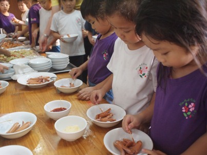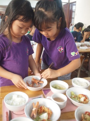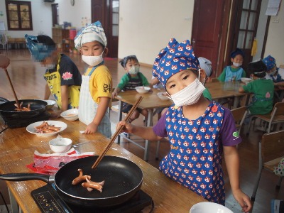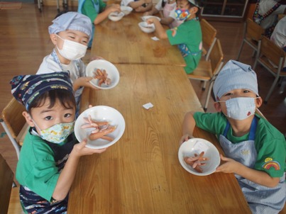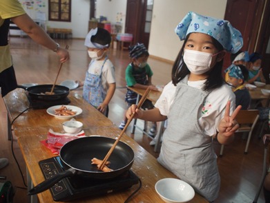 『たこさん★かにさん ウインナー』を作りました。 一年間、いろんなクッキングをしてきた子ども達^^ 4月、、おにぎり作りからスタートしました。 今では、ゆっくりと包丁を使うことができるようになりました。 最後のクッキングでなに作ろうか、、と、子どもたちと考えて、 この週は、今年最後のお弁当もあったので、 お弁当に入れられる、みんなが大好きなものを作ろうと話し決めました。 やる気十分な子ども達^^ハイチーズ ①ウンナーを包丁で切る すこし、皮が硬かったのですが、、 コロコロと、ウンナーが転がっていかないように、しっかり手で押さえて、 ぐっと力を入れて切り目を入れて行きました。 お友だちがやっているところも、気になって 覗き込んだり、 「たこにする?いかにする?」 「えっ?いかーーー!!!笑◎かにでしょー!!」 なんて、笑いながら活動を進めていくたのしい姿が見られました。 ②油でいためる 切った時には、 「なんかちがう。。」と言っていたのですが、 フライパンで炒めていくと、足が広がってきて、 「わぁー!!たこさんになってるー」と、大喜びの子ども達。 おしくなーれ!と、しっかり炒めていきました。 ③デコレーション 今回は、マヨネーズとケチャップで、目や口をつけていきました。 どんな顔にしょうかなーと、最後までたのしんだクッキング★ なんと!!!! 今回は、さくら組(年長)へのプレゼントとして、 さくら組の分も作りました。 さくら組の子ども達もすごく喜んでくれて、 すごいねー!!どうやってつくったの?!と、 聞いてくれた事が、嬉しくてこどもたちも喜んでいました。 気持ち込めて、みんなで作ってよかったです。 「どう?おいしい?」と、 聞いてる姿も、ほんとかわいいですよね◎ 簡単な活動でしたが、 幼稚園でやったことを、お家でもできると思いますので、 ぜひ!!親子でクッキングしてみてください! (#082) ベトナム・ハノイの日系幼稚園 さくらHoaAnhDao幼稚園ホーページ |