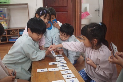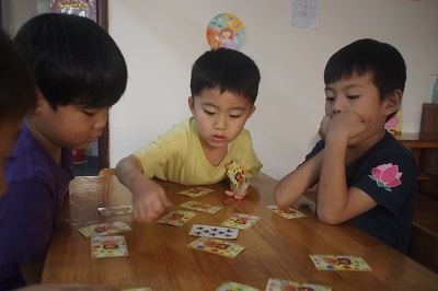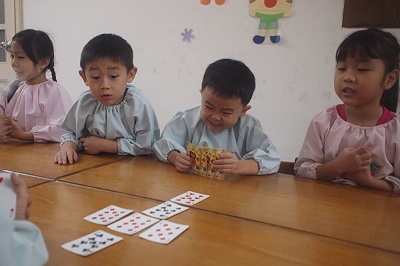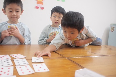 それだけではなく、いろんな遊びを取り入れて、 幼稚園生活を楽しんでいます◎ トランプ遊びを楽しめる年齢にもなっています。 これは、『7並』をしています。 みんなで、トランプを見せないように、順番にルールを守って、 「絶対勝つぞー!!」という、意気込みで遊んでいます^^; どんなことも、一生懸命な姿がわかりますね!! トランプ遊びで他には、 『ババ抜き』グループに分かれて、『真剣衰弱』など、 冬は空気が悪くなることが多いハノイで、室内で遊ぶことも増えますが、 大人が環境を作ることで、色々な遊びを知ることができます。 カードをつかっての『ひらがな並び』が、最近ブームです。 あいうえお順にカードを並べて、 そこからは、7並べと同じです。 『あ』の次は? 『け』の下は? など、遊びを通してひらがなを知ることができています。 50音あり、みんなであそぶので、なかなか回ってこないこともあったり、 「あー。。パス」ということもあるのですが、 お友達を応援したり、「やったー!次はだせるー!」と、よく見てやっています。 白熱する姿が見られていますよ!! もちろん、空気がいいときは外で元気いっぱいあそび、 園庭に、子どもたちの声が広がっています。 どんなときも、いろいろと楽しめる様に工夫し、環境を作ることは、 大人の役割だと思います◎ これからも、みんなで楽しみ笑顔いっぱい日々過ごしていきたいです。 ※インスタグラムでも、日々の様子が見られますので、そちらもご覧下さい!! |
