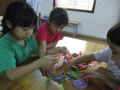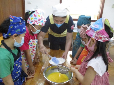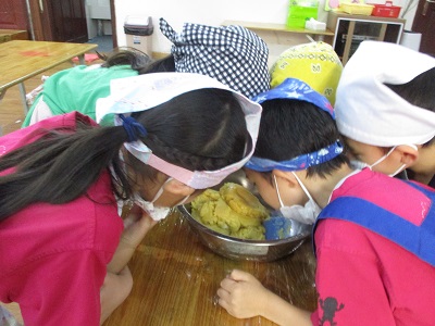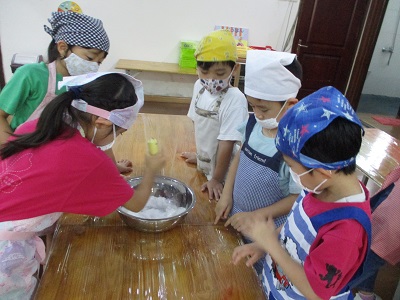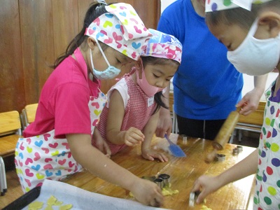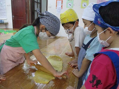 情報解禁!!! 先週、さくら組は最後のクッキングがあり、 全クラスのさくらっこ、給食の先生や用務の先生、バスの運転手さん、、 全員の先生に、感謝の気持ちを込めて、クッキーを作りました!! おしゃべり大好きな子ども達も、 「『ひみつ』だよね!」「ダメダメ見たら~!!」と、言いながら、 小さな声で(気持ち^^;)活動スタートすることができました◎ 今回、300個以上のクッキーを作りため、材料もいつもの4倍くらいの量で、、 「え?こんなにあるの?」と、驚くほどでしたが、 2つのグループに分かれて、ひとりひとり丁寧に作り上げていきました。 では、、様子を伝えながら作り方をお知らせします◎ <材料> バター 100g さとう 75g たまご 1つ 薄力粉 200g 板チョコ 100g ※この材料の4倍の量で作っています。 <作り方> ボールにバターと砂糖を入れて泡だて器で白くなるまでまぜる 机に砂糖をこぼさないように、ゆっくり丁寧に混ぜていきました。 順番も、子どもたちが決めて、スムーズに活動を進めることができて、 本当に成長を感じました。 たまごを少しずつ入れていく 「バターとたまごの色の黄色が少し違うね!!」 と、友達同士で話しをし合い、こうやって変化にも気が付いていました◎ 薄力粉をふるいながら入れて、ゴムベラでまぜる ふるいが難しそうでしたが、この時こそ!! 慎重に作っていき、「こぼれたら少なるよ」「なくなるよ」と、、^^; みんなにプレゼントすることを気にしていました。 ゴムベラについて、混ぜにくくなっていますが、、 粉の白いものがなくなるように、混ぜていきました。 「えー!こっちも白いよー」と、教え合っています。 お友達とするから意味がある姿と感じました。 混ぜながら感謝の気持ちを込めて、 「ありがと」「ようちえん楽しかったです。」と、言いながら作っています! そして、、混ぜ終わると、、 「なんかいいにおーい!」と言って、クッキータネをくんくん!! 「はぁーいいにおい」と、この状態でも食べたい気持ちいっぱいでした! 本当に、かわいい姿ですよね**