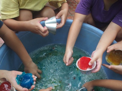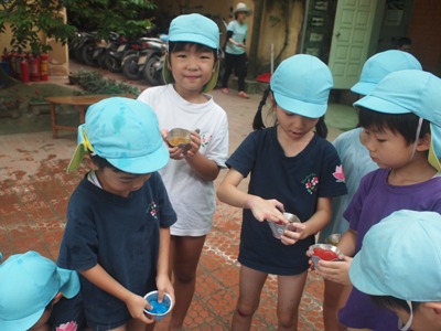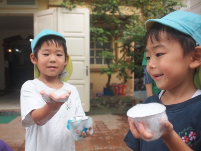 『さくら組母の日』記事はこちら ですが、、 裏話がありまして… 実は、、、 食紅を入れて、子ども達好きな色をつけてプレゼントする予定でした。。 しかし、、 思いのほか、、食紅の色が濃く、石鹸で手を洗った後手に食紅がついてしまい、 手が汚れてしまう せっかく作った『ぷるぷる★せっけん』 一人ひとつあったので、みんなで遊ぶことにしました 形や感触は変わらず、カップに入った『ぷるぷる★せっけん』をさわって、、 「わぁー!!気持ちい タライの水に入れてみみると、あわあわになり、 その、泡にも色が着いていて 「すごーい!青くなったよー」 「みんなで交換したら、きれいな色になってるー」 「おかあさんの手にも着いちゃうね」と、びっくり!! 子ども達自身が、やってみて分かった気持ちが伝わってきました。 あわあわになった手を見せてくれたり、 しゃぼん玉みたいに、「ふぅ~」と、吹き飛ばしたり、 暑いハノイでしっかり外で遊ぶことができました 母の日のプレゼントの裏話。。。 結果!子ども達もしっかり遊ぶこともできて、 お母さん達にプレゼントもすることができて、 うれしい 活動になってよかったです (#082) ベトナム・ハノイの日系幼稚園 さくらHoaAnhDao幼稚園ホーページ |